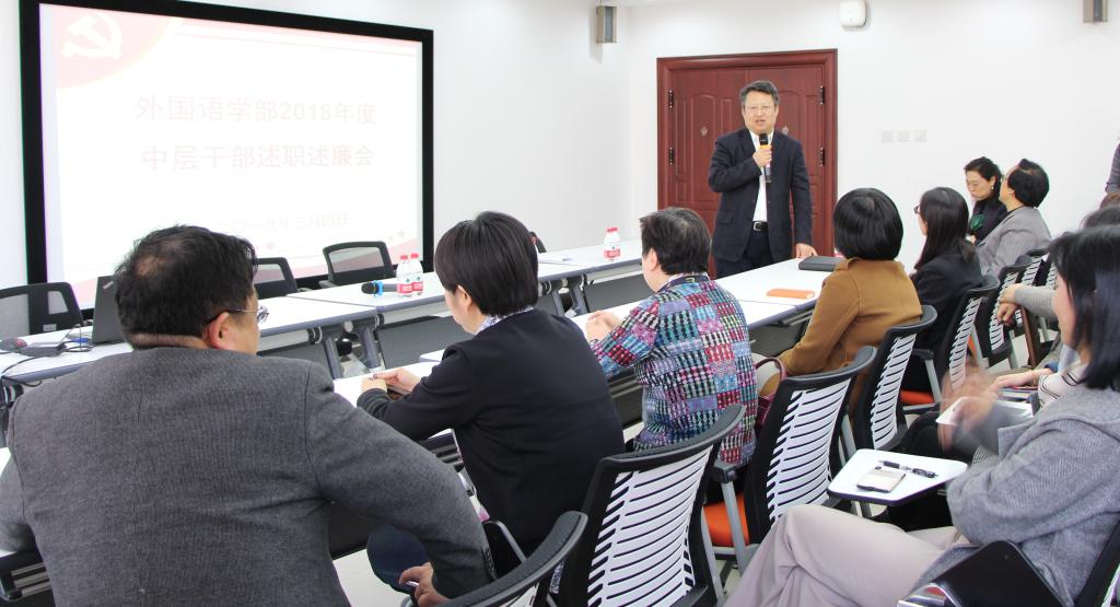 外国语学部主任高明乐就2018年的工作进行了回顾,主要从个人的德、能、勤、绩、廉五个方面对外国语学部的行政管理、教学改革、科研产出和学科建设等工作进行了梳理和总结;学部党委书记梁清从党委工作、领导班子建设、党支部规范化建设、意识形态工作、群团建设和教职工思政建设等方面对2018年的工作进行了总结述职,并对2019年的重点工作进行了部署。随后与会全体人员对述职中层干部进行了民主测评投票。