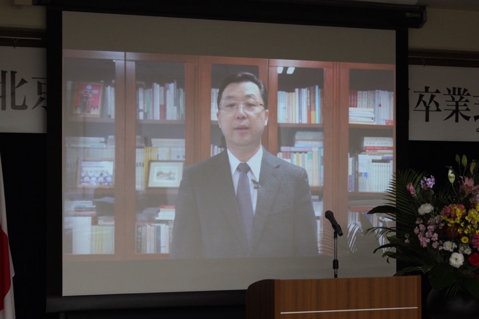 北京语言大学校长刘利特为毕业典礼发来了视频,向东京学院首届汉语言专业本科毕业生表示衷心的祝贺。刘利校长寄语学生们要珍惜四年的大学学习生活,珍惜在大学期间遇到的老师、同学和朋友,并将这些当作人生中最重要、最宝贵的财富。他希望学生们记住北语校训“德行言语,敦睦天下”,用德行和言语为人类带来和平,为促进世界和平与发展、促进世界文明的相互理解做出自己的贡献。
