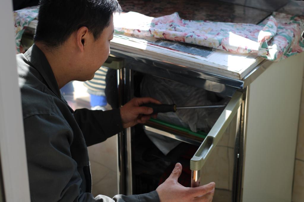 工作人员一大早就到达了社区阳光大棚,搭起了台子、摆好了桌椅,等候着离退休教职工们的到来。他们兵分两路,一队在大棚里为需要帮助的离退休教职工记录住址、联系方式和维修需求,另一队分则拿着登记好了的单子和维修需要的器具在家属楼之间穿梭。对于因没有维修需要的家居配件而暂时无法马上维修的任务,师傅会协助离退休教职工购买合适的配件,并且约定好时间再上门维修。