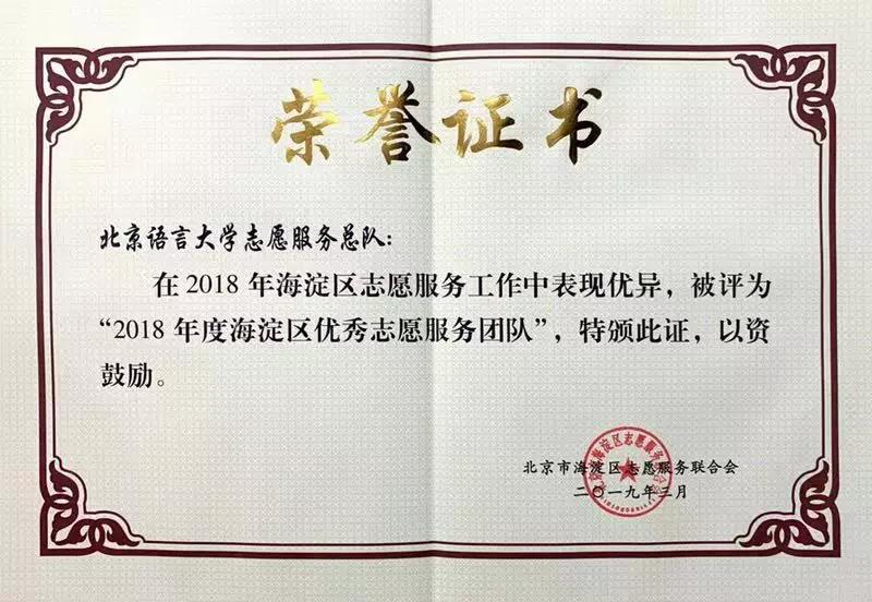 2018年我校志愿服务工作取得了长足的发展:北语志愿服务总队被评为“2018年度海淀区优秀志愿服务团队”;总队长期志愿服务活动——“语至华园,牵手世界”之小联合国进社区活动,以其优异的表现被评为“2018年度海淀区优秀志愿服务项目”。这体现了海淀区志愿服务联合会对总队志愿服务工作的认可,也对总队旨在引领更多人走向志愿的彼岸,点亮志愿服务的美好明天的工作信念给予了肯定。
