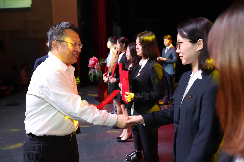 随后,大会表彰了2018-2019学年五四优秀团员、团干、团支部,并为“青年五四奖章”获得者——胡瀛、姜雨萌、佀庆一、花正、曾馨颉、郭子萌、陈思、梁紫君、王璇、阿不都克依木·买合木提、王鹤霖、袁广慕、毛宇峥、张璇、努尔古丽·穆斯林、北京语言大学国旗护卫队等16个个人和集体——颁奖。外国语学部胡瀛、人文社会科学学部阿不都克依木·买合木提、国旗护卫队全体成员作代表发言。