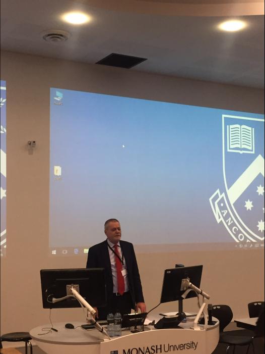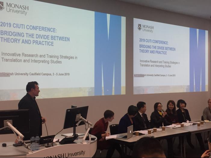 6月3日上午,在正式会议举办之前,先召开了小型工作坊,主题为字幕翻译与媒体。当天下午召开大会开幕式,开幕式上莫纳什大学教务长Marc Parlange教授、CIUTI主席Maurizio Viezzi教授分别致辞。简短的开幕式后,大会进入第一项议程,由来自澳大利亚、中国和美国的学者讨论亚太地区的口笔译现状。我院负责人王丽虹博士应邀参与此环节,就主持人提到的亚太地区翻译教学、就业、培训等问题与大家展开讨论。