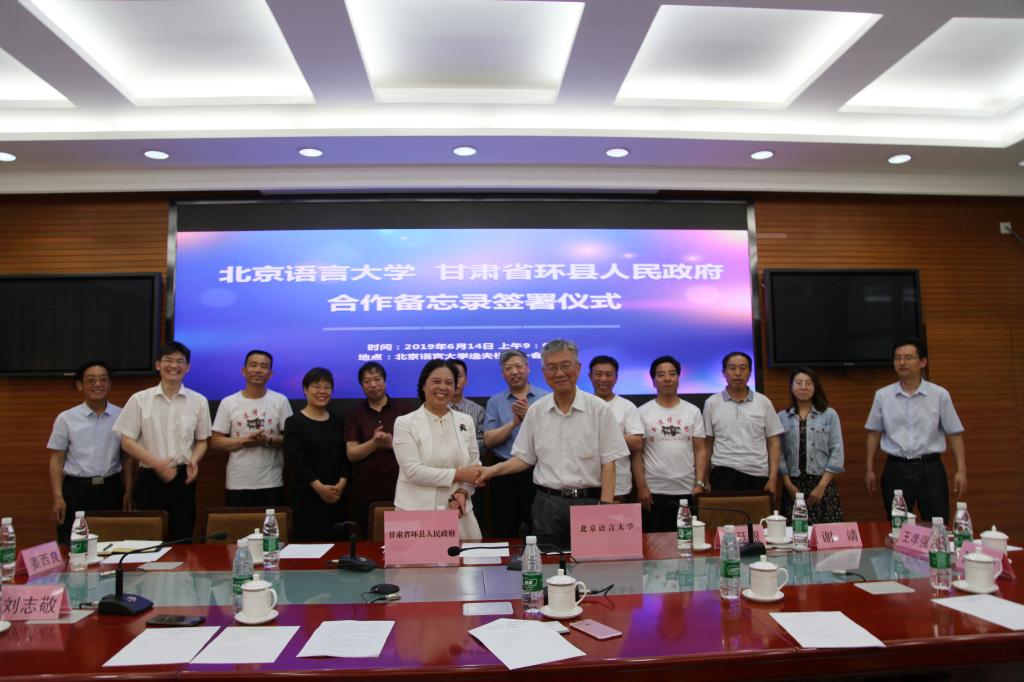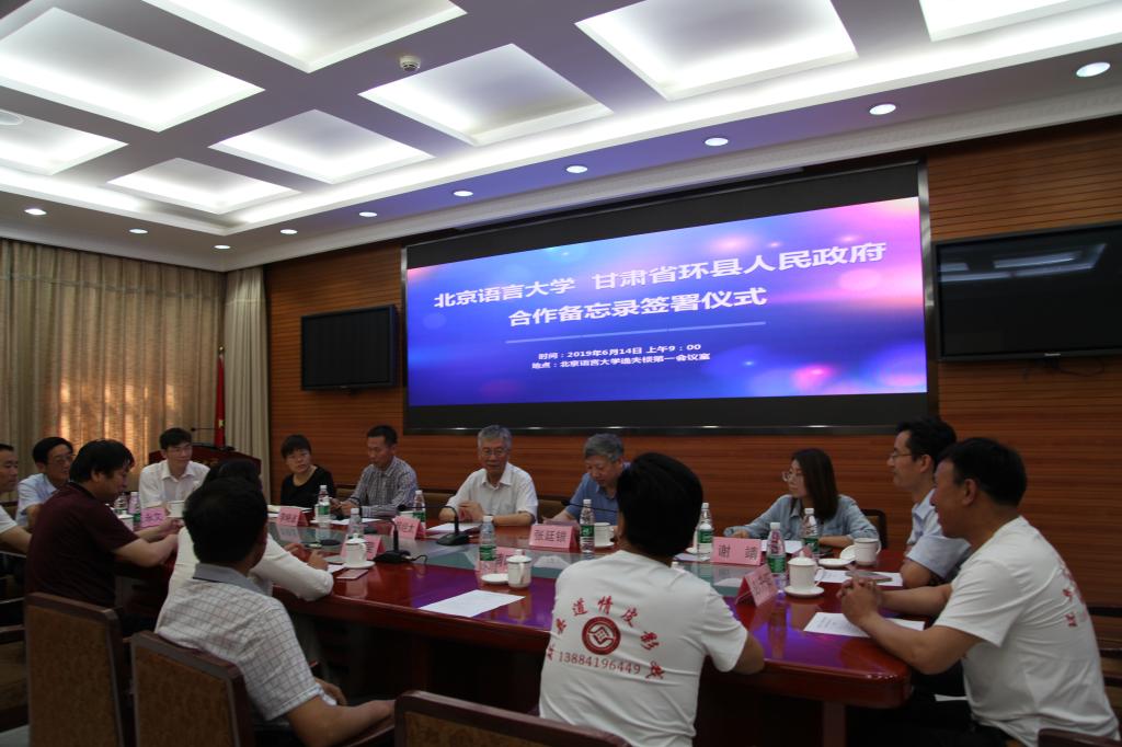 6月14日上午,北京语言大学与甘肃省环县人民政府合作备忘录签署仪式在北京语言大学隆重举行。甘肃环县人民政府代表,副县长潘雪莹、县文化局干部张玉卿 、国家级非遗传承人高清旺、皮影艺术家彭升阳、王永文、赵三姓、许明堂,北京语言大学中华文化研究院院长韩经太,中华文化研究院教授张廷银,以及科研处、教务处、中华文化研究院、国内合作与继续教育办公室等相关单位负责人出席签字仪式。
