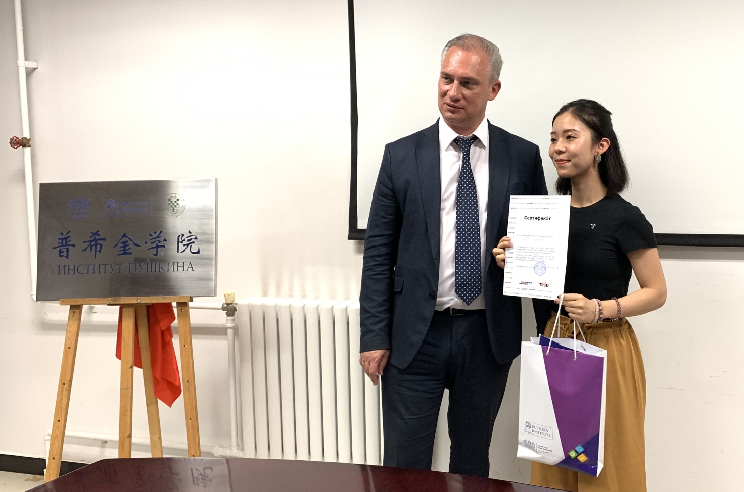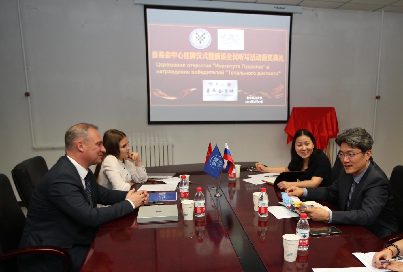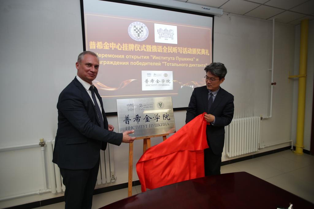 会谈结束后,双方共同为两校共建的普希金学院揭牌。普希金学院是“普希金学院”教育网络框架下鼓励和发展校际合作,发展俄语语言教学课程,提供优质教师培训和专业发展机会的半实体机构,主要活动为利用网络平台组织有关俄语、文学和文化以及有关国家语言的创造性、趣味性知识竞赛,和设计学生教育游学计划,并为学生提供网上教学资源等。与我校共建的普希金学院是在中国国内建立的第十所普希金学院。普希金学院的建立为俄语学习者搭建了一个便捷获取网络资源与信息的平台。