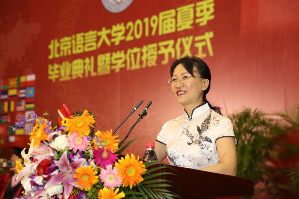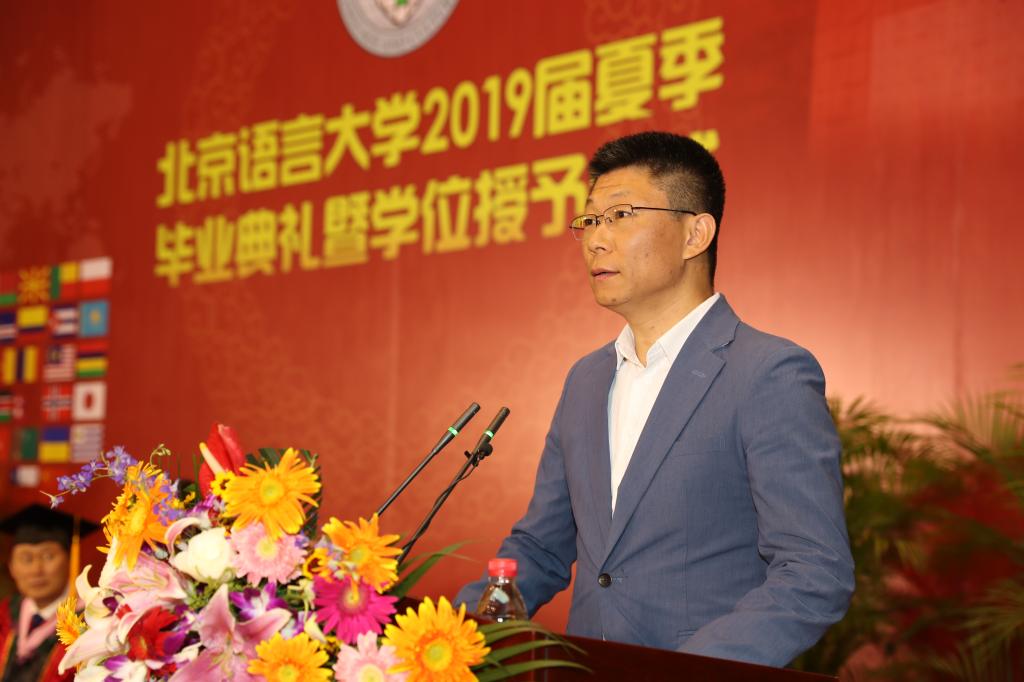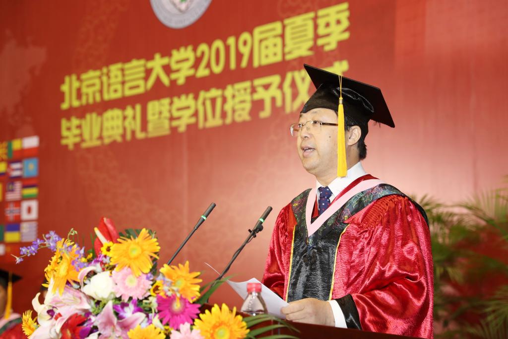 校长刘利教授在致辞中,向2019届全体毕业生表示热烈祝贺,向为毕业生成长付出心血的父母、师长、亲友表示衷心感谢。他说,“今天是一个收获成长、启程远航的日子。今天的毕业仪式只标志着同学们长成了一棵健康的树苗,走出校园之后,你们还需要经受住风吹雨打,才能成长为壮硕的大树。涉世从今始,立身靠奋斗。”他寄语毕业生们要树立高远理想,为奋斗找准方向;坚持终身学习,为奋斗注入能量;磨炼坚韧意志,为奋斗提供动力;担当责任使命,为奋斗增添荣光。他希望毕业生们能够谨记北语校训“德行言语,敦睦天下”,能将家国情怀与人类关怀作为追求的目标,在奋斗中实现自己的人生价值。