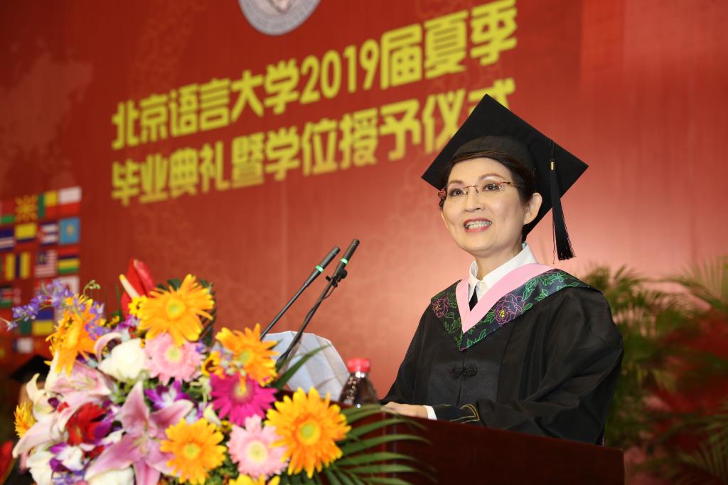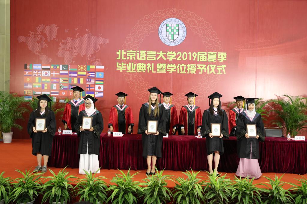 毕业典礼上,学校领导为2019届北京语言大学优秀中外毕业生颁发了荣誉证书和奖牌。学位授予仪式上,学校领导为毕业生拨穗。