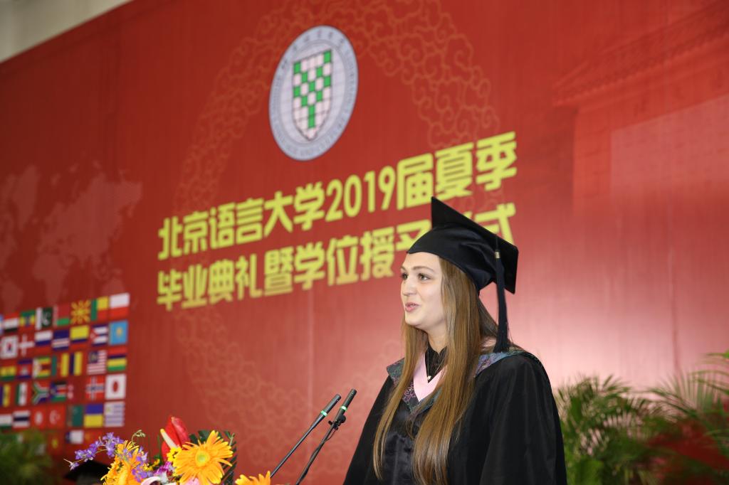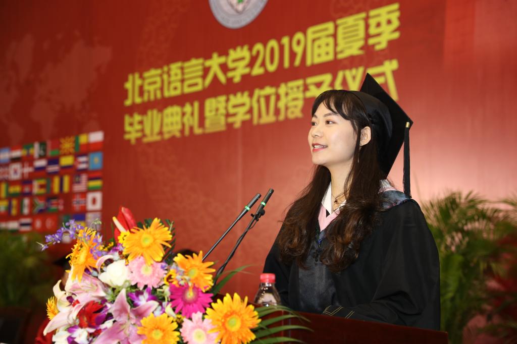 汉语学院的丹麦留学生林霜琳代表国际毕业生发言,她说,“今天我拿到了一支新笔,它叫‘汉语言本科’。我希望将来能够用这支笔继续写我的故事,也许会用它写一段话,题目就叫做‘工作’。今天现场的每一位毕业生,我不知道你们来到北语之前都写了些什么,但今天每个人都会拿到一支跟我一样的笔。我们要用这支笔写什么,没有统一的正确答案,但我相信每个人都会写出自己绚丽的人生篇章。”