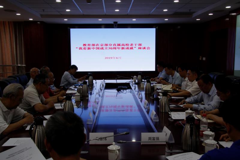 6月25日上午,在京部分直属高校老干部“我看新中国成立70周年新成就”座谈会在我校综合楼909会议室顺利召开。来自学院路地区的六所高校中国农业大学、北京科技大学、中国地质大学(北京)、中国矿业大学(北京)、北京林业大学、北京语言大学的7为老同志以及离退休工作部门的负责同志参加了会议。教育部老干部局党委副书记、副局长潘俊强主持会议,教育部老干部局组织人事处、生活管理处负责同志到会参加。