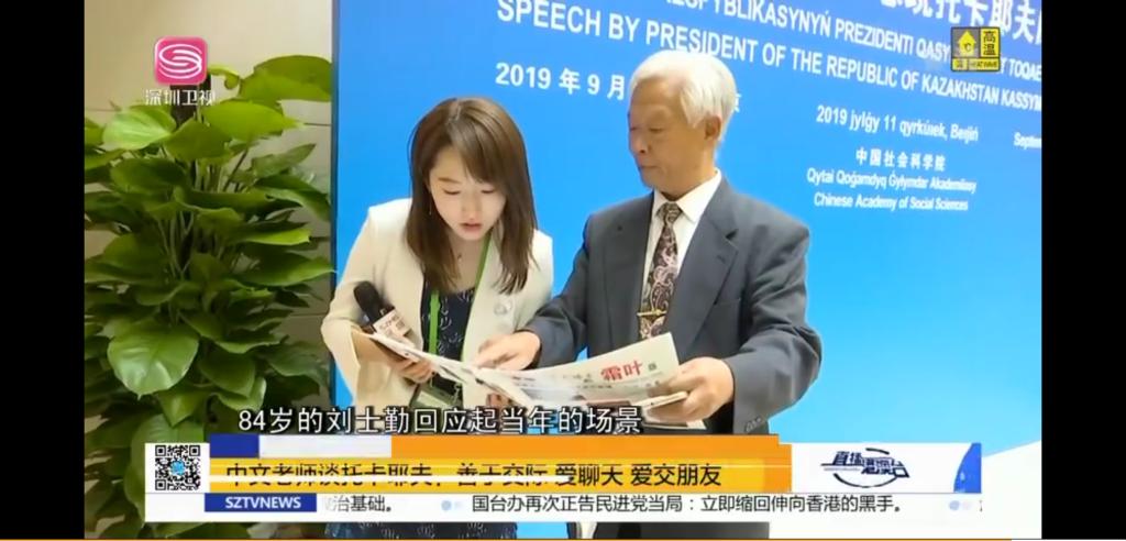 幸运的时刻终于到了,我在哈方工作人员引导下,刚走到报告厅门外的会标墙前,托卡耶夫阁下突然从左侧走过来,我俩的双手紧紧握在一起,几秒种后,他首先对我说:“老师,您还这么健康啊!”我忙说:“35年前你31岁,我45岁。如今两位黑发人都满头银发了,岁月不饶人啊!今天看到你太高兴了。刘利校长让我转告您,他盛情邀请您,衷心欢迎您访问北京语言大学!”他高兴地说:“下次访华一定重回母校,看望老师。”并说:“我也邀请您来我们哈萨克斯坦共和国访问。”我忽然想起,总统馈赠给我的礼品放在旁边呢,我立刻取出来递给托卡耶夫,在数十家媒体记者见证下,我当面从他手中接过这份珍贵礼物。两人的手再次握得紧紧的,紧紧的。我们好像要表达一个共同愿望:愿中哈两国人民的友谊像泰山上的青松一样,万古常青!愿两国的文化教育交流像黄河之水一样,永远川流不息!