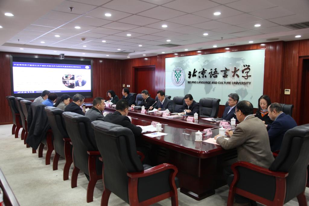 党委副书记、校长刘利作了“学校学科建设规划实施进展和建设成效”和“学校人才队伍现状和中青年人才培养、发展”两个专题调研报告。调研组通过校内讨论交流抓住问题,校外调研学习取经梳理问题。针对我校学科门类偏少、学科力量偏弱、优势学科位次偏低的问题,他强调要加强顶层设计,实施《北京语言大学学科能力提升计划》,强化对学科建设全局的指导,推进五项重点工作:一是完善学科体系。构建“1(围绕汉语国际教育研究的高峰学科)+3(中国语言文学、外国语言文学含翻译专业学位、语言学等高原学科)+5(马克思主义理论、计算机科学与技术含软件工程专业学位、心理学、教育学、新闻传播学等支撑学科)+5(政治学、中国史、金融、会计、艺术等培育学科)”的学科建设布局。二是突出特色学科。深化学部制改革,将管理重心上移,打通学院壁垒,加强学历教育。三是强化优势学科。加强中国语言文学建设,推动外国语言文学转型,着力国别区域学建设。四是扶持弱势学科。搭建学科平台,引进人才,开展学科协同。五是新建相关学科。推动现有学科落地,增补必要学科。围绕人才队伍建设存在的高层次领军人才缺、中青年骨干力量弱、青年拔尖人才队伍小的问题,他提出四项重要举措:一是内外平衡、稳定队伍;二是重点支持、壮大队伍;三是用力扶持、培育队伍;四是创新制度、激励队伍。