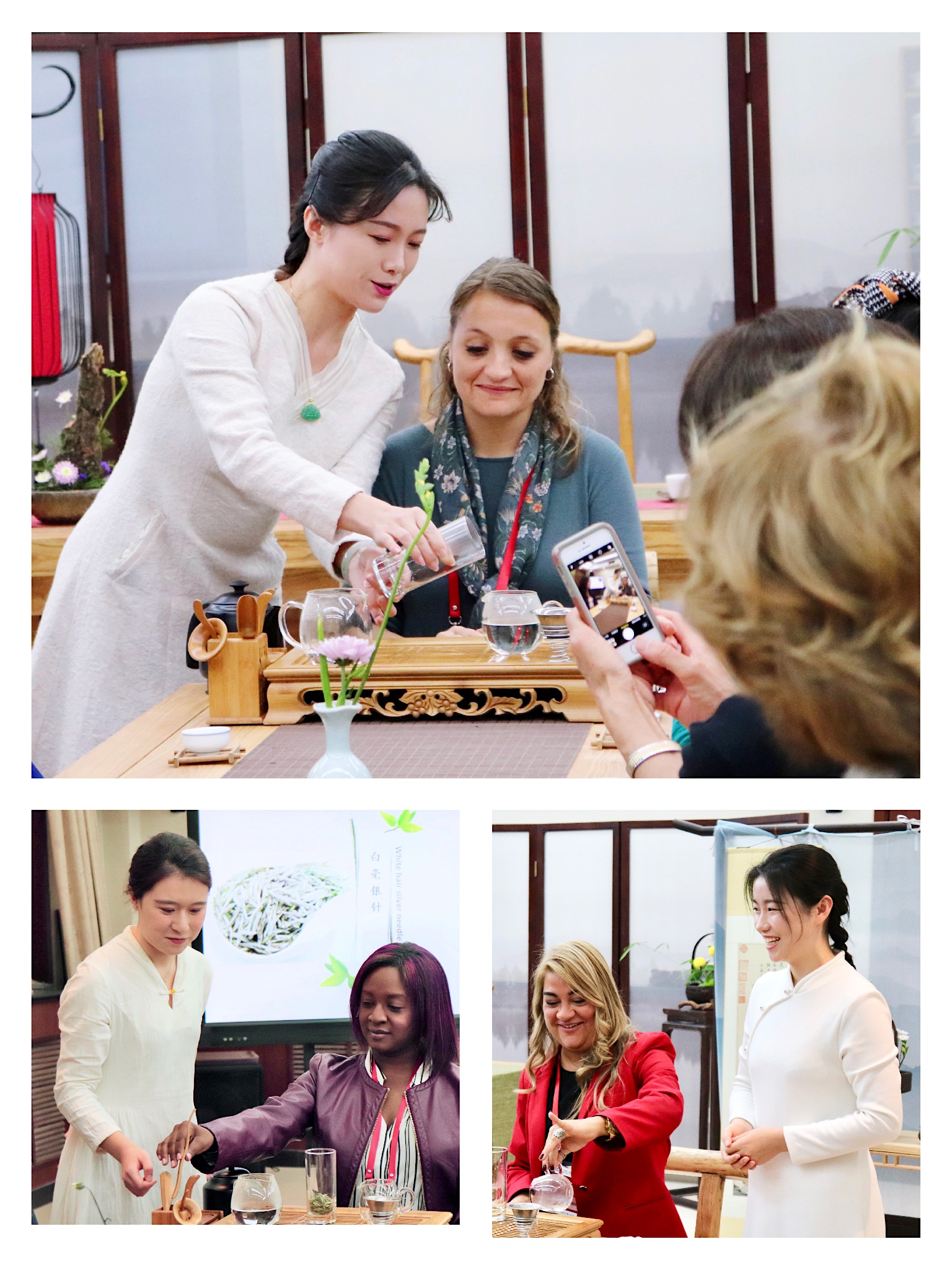 演绎行茶仪轨时,于璐、刘潇、何柏三位老师身着素雅茶服,为来宾展示了行云流水般的中国茶冲泡技艺。展示结束后,三位校长自告奋勇,在老师的指导下,动手体验了如何优雅地泡好一杯中国茶。