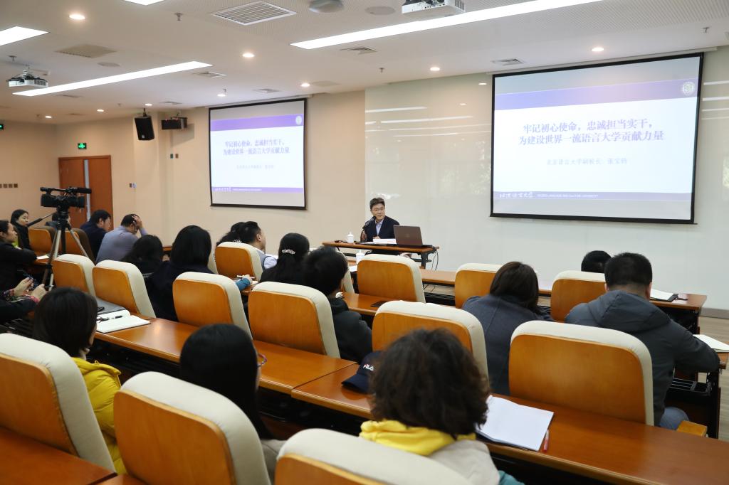 最后,张宝钧副校长提出,我们要在以习近平同志为核心的党中央坚强领导下,牢固树立“四个意识”,坚定“四个自信”,坚决做到“两个维护”,深入贯彻全国教育大会精神,保持和发扬马克思主义政党与时俱进的实践品格,永葆旺盛生命力和强大战斗力,应对新的各种形式的重大挑战和风险、克服各种重大阻力和矛盾,真抓实干,开拓进取,扎根中国办教育,办人民满意的教育,努力写好新时代教育的奋进之笔,为把北语建设成为世界一流的语言大学、为实现中华民族伟大复兴的中国梦作出新的更大贡献。