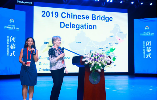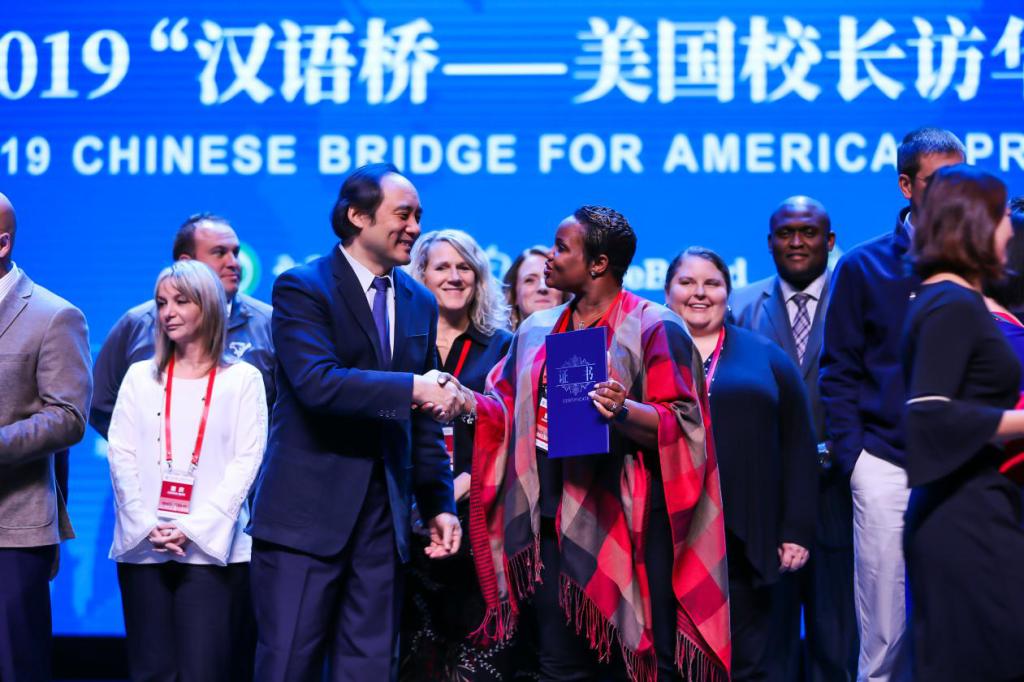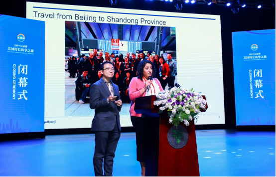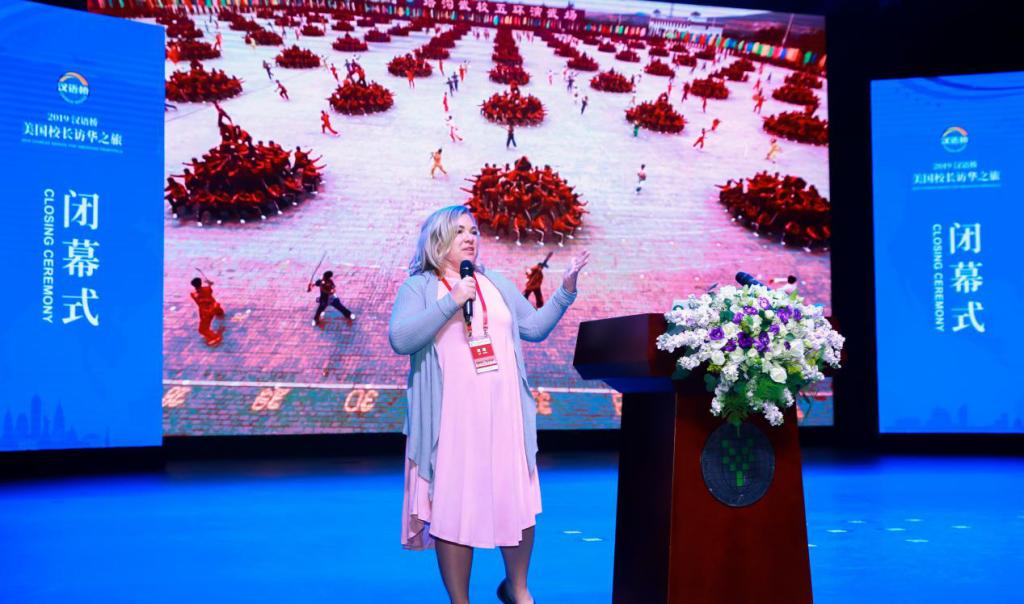 10月28日下午,由孔子学院总部与美国大学理事会共同主办,北京语言大学承办的2019“汉语桥-美国校长访华之旅”在北京语言大学梧桐会堂圆满落幕。出席本次闭幕仪式的嘉宾有孔子学院总部副总干事赵国成先生、孔子学院总部交流处处长滕连帅先生、美国大学理事会中国语言和文化项目主任戴静山先生、北京语言大学校长刘利先生、国际教育管理处/孔子学院工作处处长陈丽霞女士,来自美国的170位教育行政官员及中小学校长以及来自河南、广东、山东、吉林、浙江和重庆省市代表。