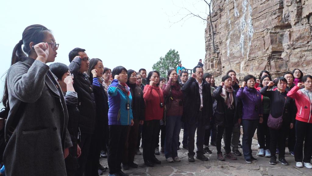 11月2日,老师们首先来到红旗渠的咽喉工程——青年洞。踏上气势恢弘的红飘带廊桥,行走在不足两米宽的渠墙上,身旁就是陡立的峭壁,脚下便是数丈高的悬崖,大家踏上298层石阶,沿着主干渠一路向上,沿途经过创业洞、团结洞、鹰嘴山、一线天、虎口牙,步行超过3公里最终达到了青年洞。在青年洞前,老师们面向党旗、举起右手、重温入党誓词,铮铮誓词,字字千钧,点燃了老师们心中的激情之火、忠诚之火,让人时刻铭记共产党人的庄严承诺和立德树人的神圣职责。晚上,大家观看了大型原创音乐舞蹈史诗《走近红旗渠》,演员们全情投入、忘我表演,通过太行悲歌、太行壮歌、太行欢歌三个篇章的演绎,让大家仿佛回到了当年铁锤叮当、钢钎铿锵、绝壁穿石、挖渠千里的现场,重温了林州人民靠一锤一铲、苦战十年、创造人间奇迹的光辉历史,深切体会到红旗渠这一伟大历史工程的背后,蕴藏了无数可歌可泣、震撼人心的悲壮故事。第二天上午,老师们前往红旗渠纪念馆参观学习,通过观看纪念馆内的实景模型、修渠旧物、影像资料、文字照片等珍贵历史资料,老师们更加深刻地体会到修渠过程的曲折艰辛和红旗渠精神的丰富内涵,对于林县干部百姓构思未来的智慧和胆识、实现梦想的勇气和担当、脚踏实地的干劲和力量感到无比钦佩和敬仰。