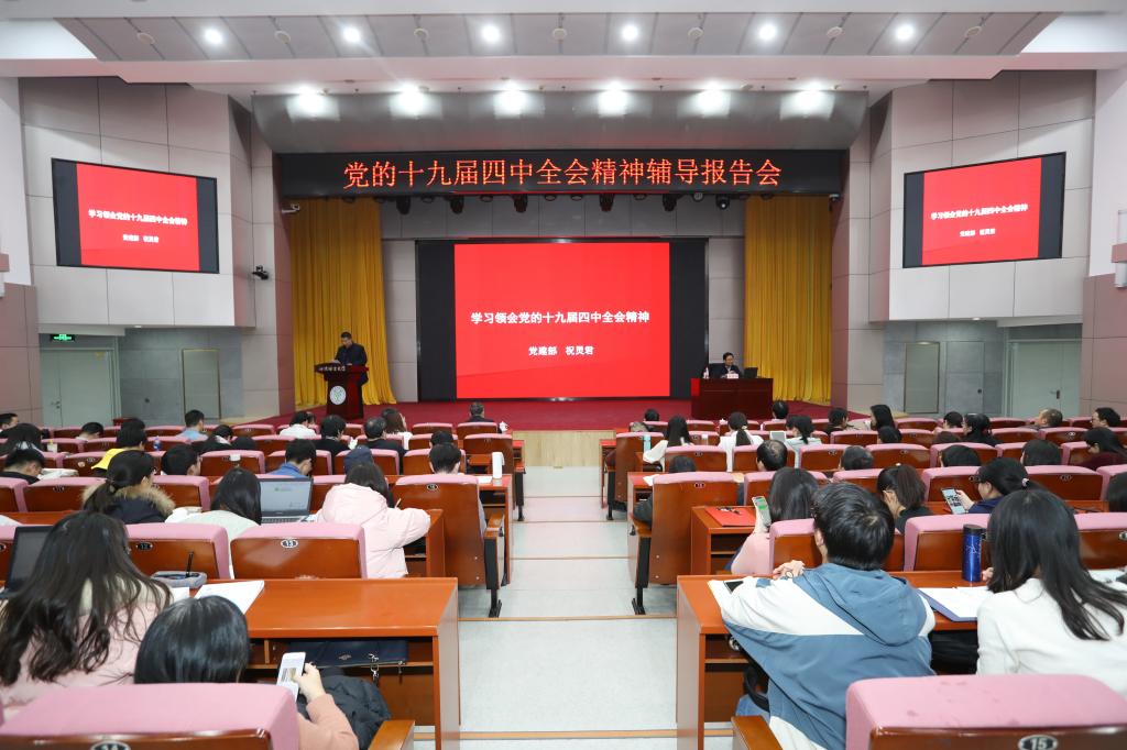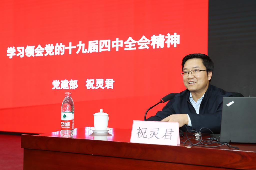 为深入学习宣传贯彻党的十九届四中全会精神,11月28日下午,学校党委邀请中央党校党建教研部副主任祝灵君教授作了题为《学习贯彻党的十九届四中全会精神》辅导报告。学校领导班子成员、中层干部、教师学生党支部书记和师生党员近400人参加了报告会。报告会由党委宣传部常务副部长展明锋主持。