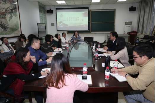 1月9日下午,北京语言大学2019年度学生工作总结交流会在教四楼213会议室召开。校党委常委、副校长黄益方、各学部院系学工负责人和全体辅导员出席了此次大会。会议由学生工作部部长黄展主持。