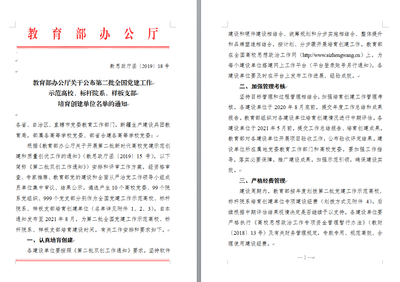 近日,教育部公布了第二批新时代高校党建示范创建和质量创优工作评选结果。我校人文社会科学学部党委成功入选“全国党建工作标杆院系”培育创建单位,汉语国际教育学部汉语速成学院党支第一教研室党支部(现汉语国际教育学部进修系党支部)成功入选“全国党建工作样板支部”培育创建单位。