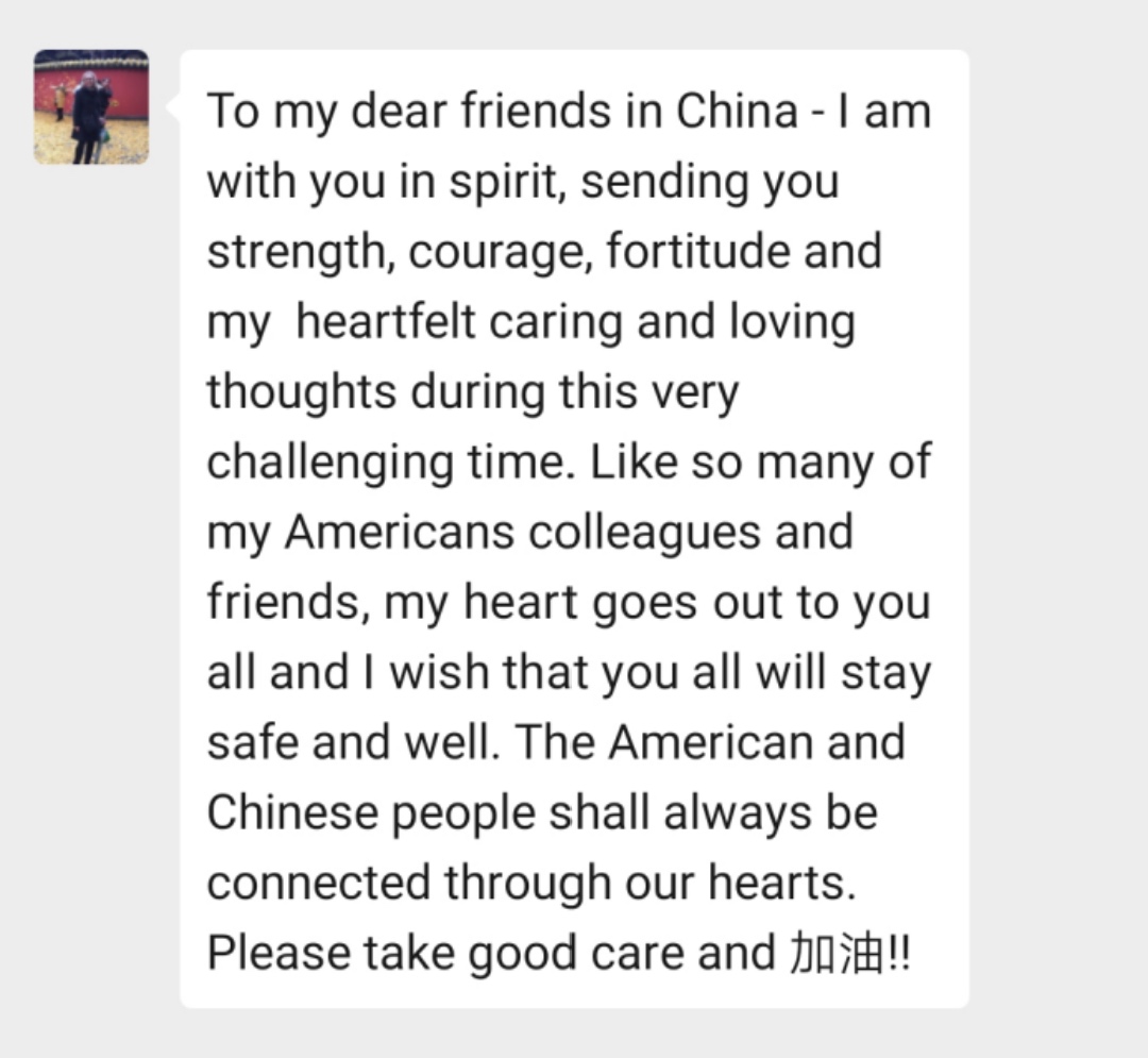乔治梅森大学孔子学院外方院长Lucia向中国朋友发来慰问,她向中国亲爱的朋友们在这个充满挑战的时刻,向大家传递力量、勇气与衷心的关怀和爱心。“像我的许多美国人同事和朋友一样,我向你们所有人表示敬意,我希望你们所有人都能保持安全和健康。美国和中国人民将永远通过我们的心相连,请保重并加油!”