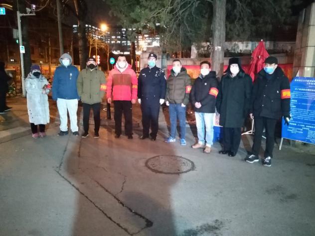 社区工作人员、离退休工作处工作人员、学院路街道管片科室、社区民警、社区志愿者在校西南门进行夜间值守