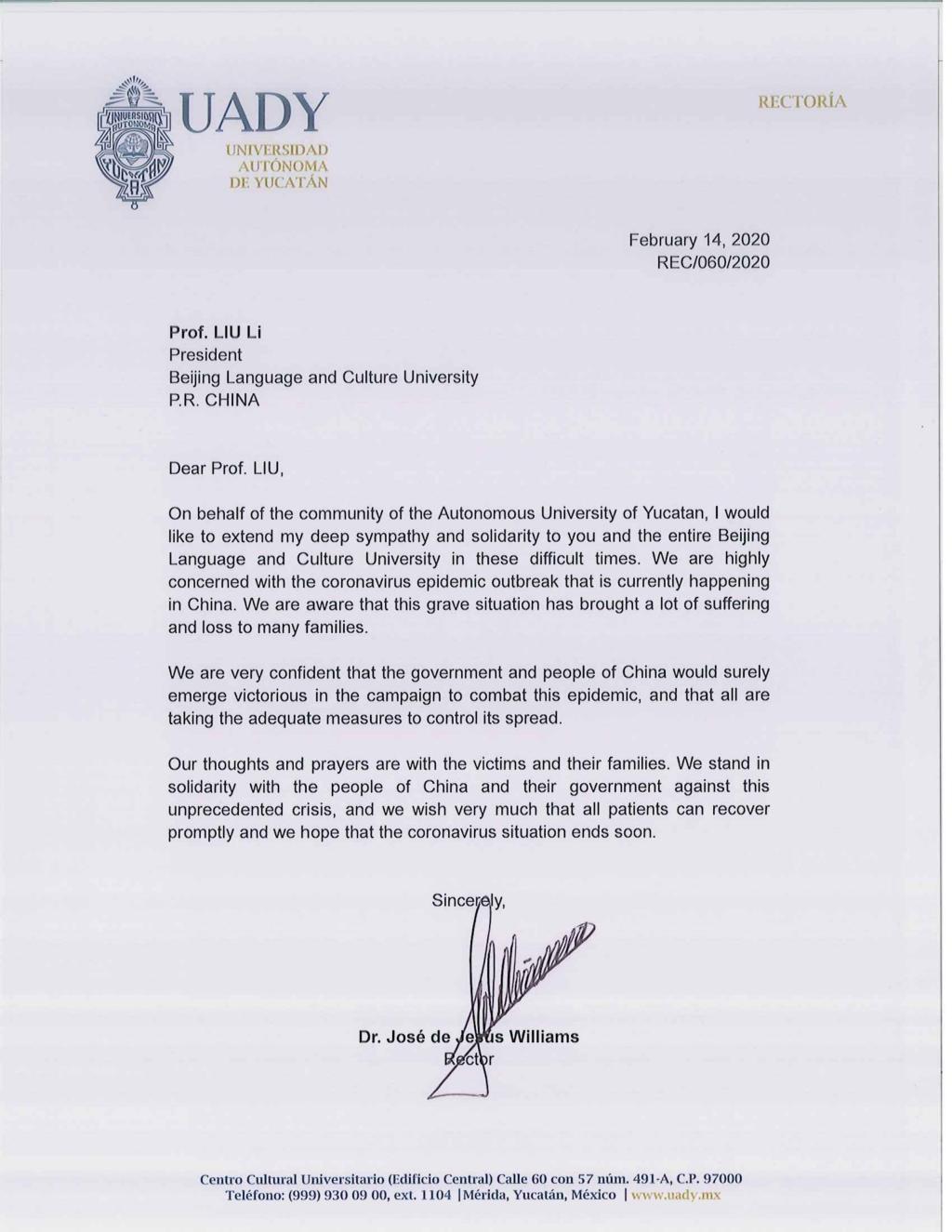 墨西哥尤卡坦自治大学校长何塞˙威廉姆斯致信北京语言大学校长刘利,送上特殊时期的慰问与祝福。何塞˙威廉姆斯校长在信中表达了深切的关怀和声援,他写道:我们深知这场疫情给很多家庭带来痛苦和损失,但我们同样坚信中国政府能采取适当的措施来控制疫情的蔓延。我们的祈祷和祝福与你们同在。