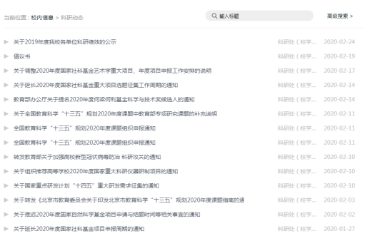 1月27日以来,科研处在数字北语“科研动态”版块共计发布科研相关通知12条,其中关于项目相关的10条,奖项申报相关的1条,科研绩效公示的1条。与项目相关的10条通知中,关于项目常规申报和选题征集的5条,关于项目申报或选题征集延期的4条,关于新增类别项目临时申报和选题征集的1条。通过发布这些正式通知以及在各种相关微信群的沟通和交流,科研处保证了这一时期信息渠道的畅通,主动及时地向广大教师传达了上级主管部门的最新工作部署和文件精神。