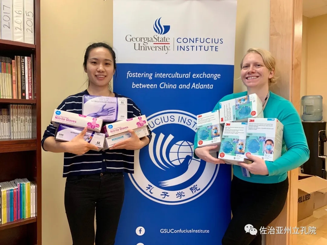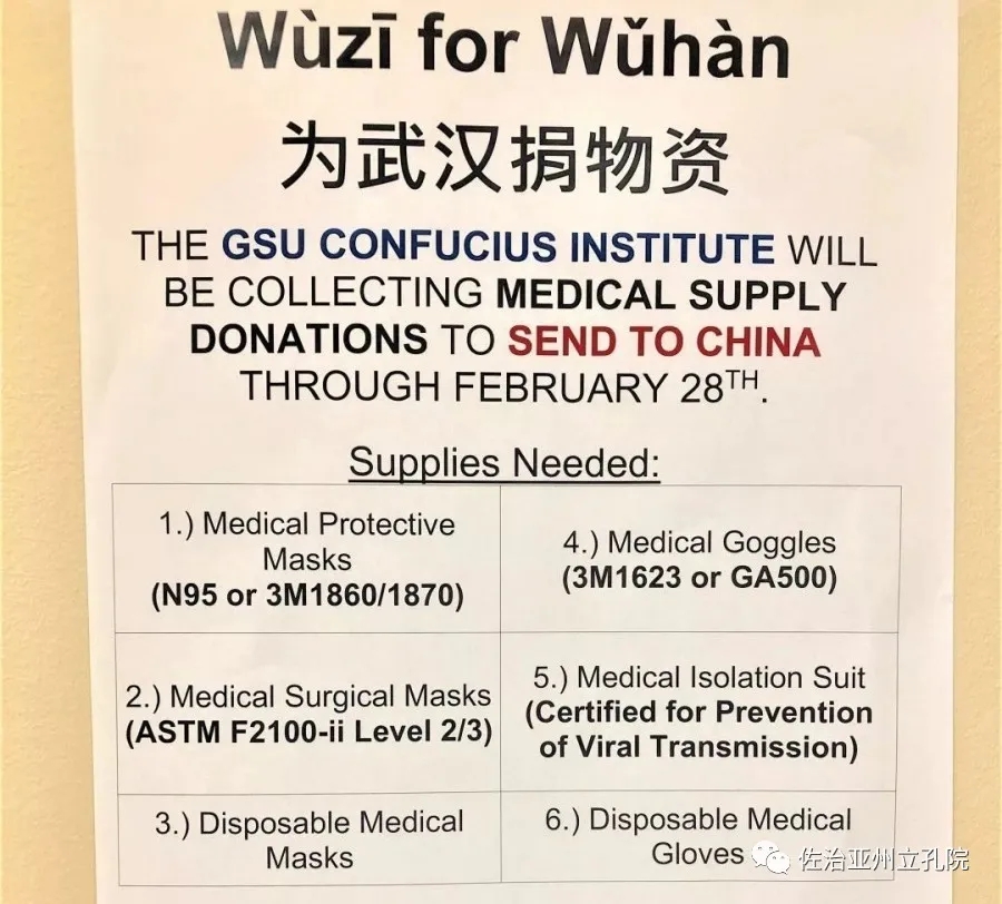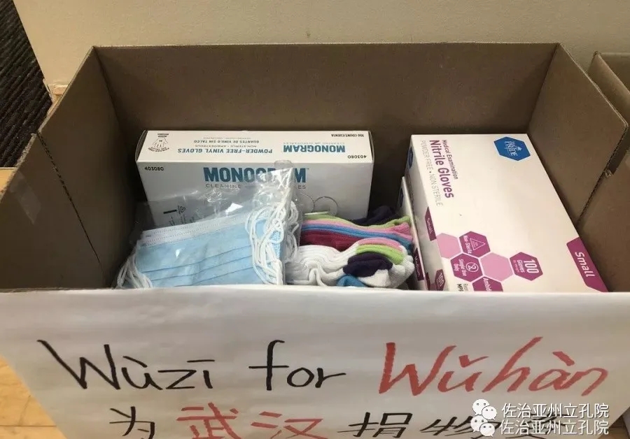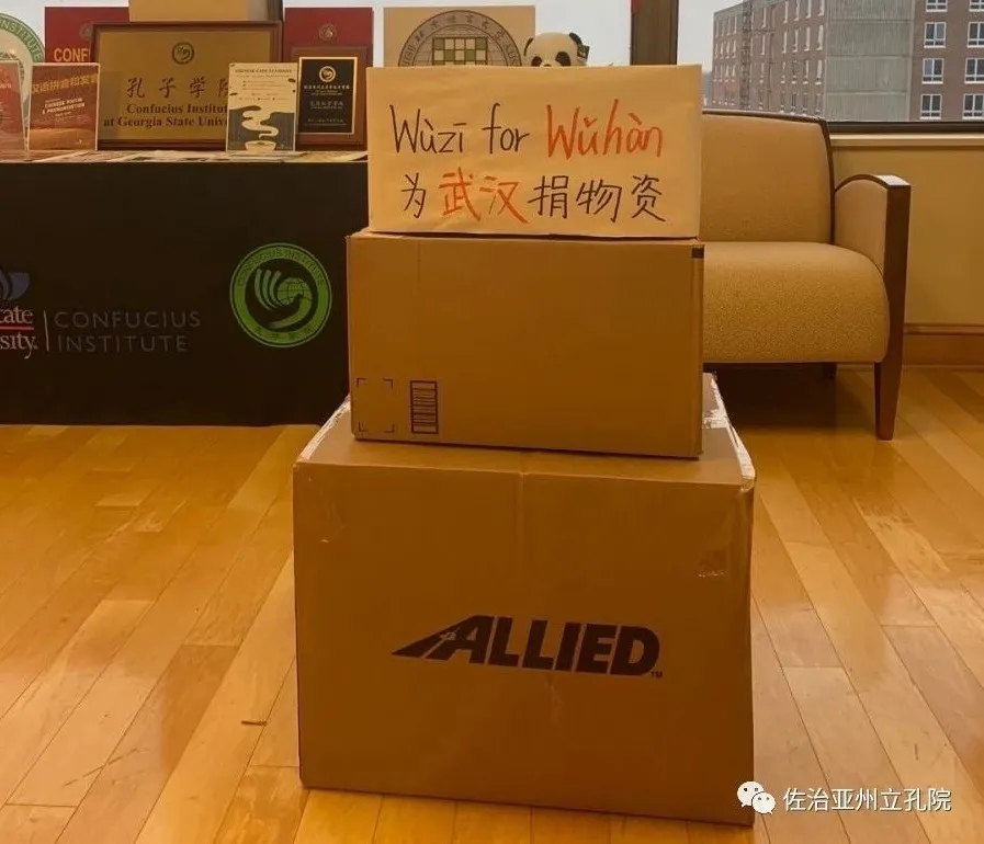 佐治亚州立孔院时刻心系国内疫情,在佐治亚州立大学孔子学院中方院长朱姝和外方执行院长金伯利·亨肖(Kimberly Henshaw)的组织带领下,孔院全体工作人员近两个月在大学一些相关部门收集捐赠物资。孔院将二十多个为武汉募捐的箱子分发在佐治亚州立大学一些部门,外方执行院长金伯利·亨肖(Kimberly Henshaw)还特地为箱子贴上标语“wùzī for wǔhàn”并附上了具体的物资捐赠标准。