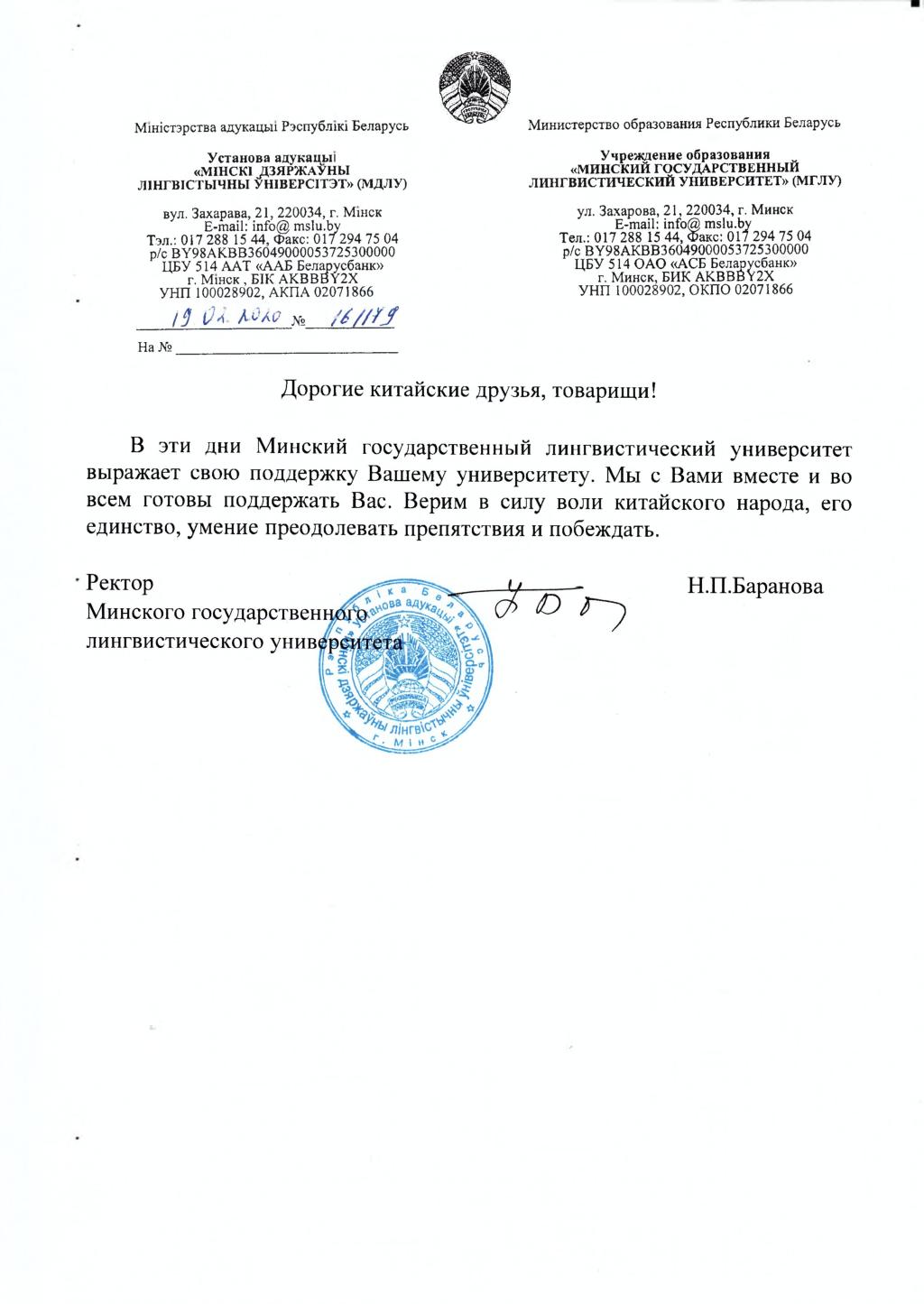俄罗斯明斯克国立语言大学特意致信北京语言大学,字里行间满是关心和祝愿:亲爱的中国朋友,明斯克国立语言大学表达对您大学的支持。我们与你们在一起,并全力支持你们。我们相信中国人民的力量和团结,相信你们克服困难并赢得胜利的能力。
