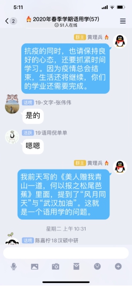 在黄理兵老师的语用学课堂上,黄老师开篇引经据典,结合疫情实际,用“风月同天”和“武汉加油”的顺序问题,深入浅出地帮助同学们理解语境与语义的关系,进而引出语用学的概念,同学们听完大呼“实在是妙!”。