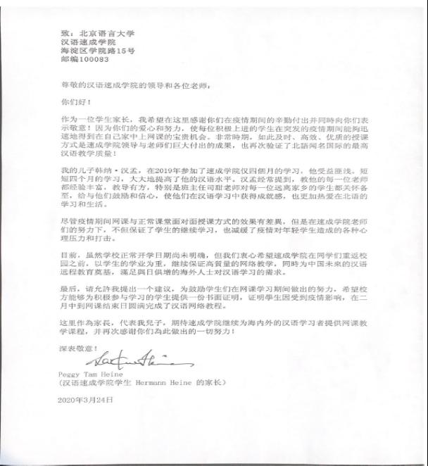 Peggy Tam Heine女士最初是打算用英文写感谢信的,但为了表达对汉语速成学院和老师们的敬意,她在写完英文版的感谢信后自己进行了翻译,并请身边懂汉语的朋友帮助检查语法错误。学院在收到感谢信后,第一时间给Peggy Tam Heine女士写了回信,感谢她对学院的信任,学院也将继续做好线上教学工作,确保疫情期间各国留学生的汉语学习能够一如既往地取得最佳的学习效果。
