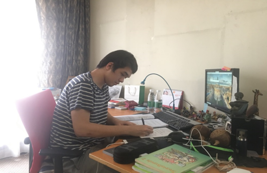 汉孟同学在家认真学习汉语
