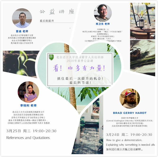 在过去的几周里,公益网课收获了社会上海洋般的赞美:“良心课程,温度北语,干货满满……”赞美的背后是陈卫东、李晓利、曾迪、Brad Hardt四位老师尽心备课的精华呈现,是连续两个月每天晚上出国部全体工作人员的坚守,是老师们早七晚十在6个学员微信群里的答疑解惑,是每天白天带着三千人一起做听力的坚持,是从无心赏雪景到在线赏樱花的时空更迭。出国部此次疫情期间对大学公益事业进行了有益尝试:抛下投入与产出,从学员需求出发,从学员便利考虑,遵循教育初心,用正能量回馈社会,为同心协力阻击疫情做一份贡献。这就是我们公益网课的样子,这也是北京语言大学出国留学人员培训部的使命,以己之长,成就他人。