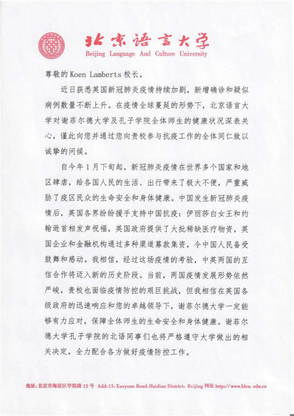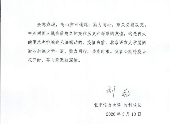 在信中,刘利校长首先感谢在中国疫情爆发之初,各所孔院及其所在的海外高校向中国伸出的援助之手。比如,美国南卡罗来纳大学孔子学院组织当地华人社区,共同募集多批医疗物资;韩国启明大学给北语寄送口罩;美国佐治亚州立大学孔子学院设计募捐物资箱,由专人负责进社区募捐;更有那些从五湖四海传来的加油视频,祝福卡片,在中国战疫最艰难的时期,给了我们莫大的安慰和鼓励。同时,刘利校长也对孔子学院院长、教师、志愿者和工作人员在疫情期间坚守岗位表示了充分肯定。