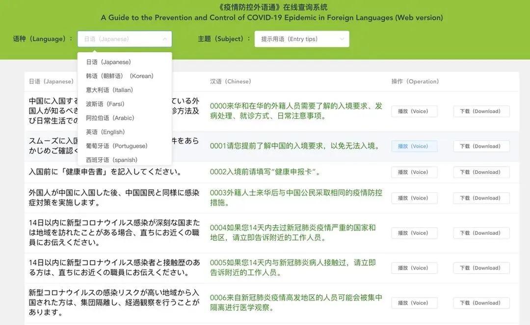 近来新型冠状病毒肺炎在全球蔓延,国际疫情形势日趋严峻。在教育部、国家语委指导下,北京语言大学语言资源高精尖创新中心作为“战疫语言服务团”的骨干单位,紧急研发了《疫情防控外语通》,为在华来华留学生以及外籍人士提供疫情防控和治疗方面的语言服务,减少日常及就诊过程中的沟通障碍。