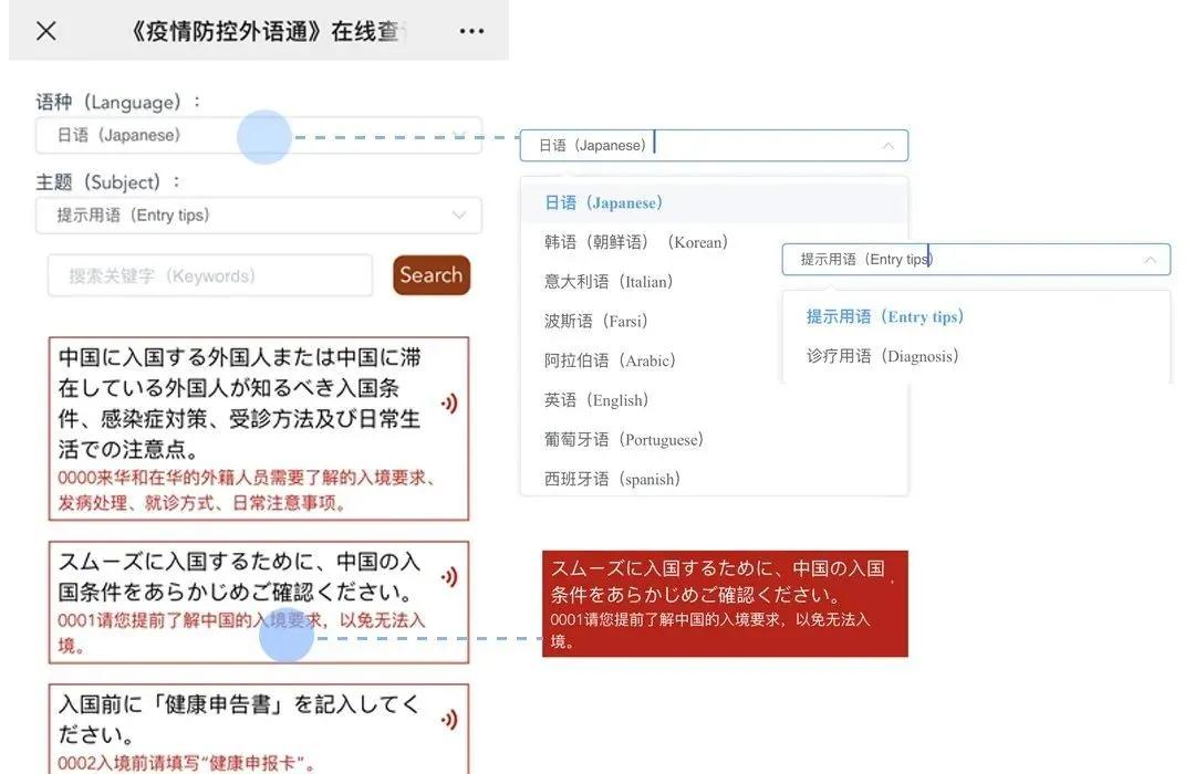 《疫情防控外语通》根据国家卫健委发布的新型冠状病毒肺炎防控方案和诊疗方案,参考国家有关防控通知,遴选整理了日常注意事项、入境注意事项、就诊常用句、个人防护措施等四方面共75个常用句子,目前《疫情防控外语通》已经制作成包括韩语(朝鲜语)、日语、波斯语、意大利语、阿拉伯语、英语、德语、俄语、法语等35个语种的微视频和多媒体卡片,并开发了微信平台版和电脑网页版在线查询系统。