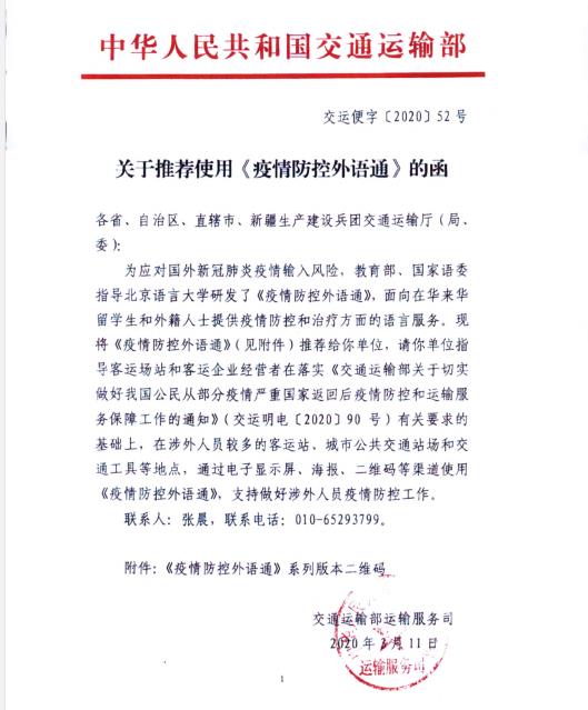 近日,为做好疫情防控期间外籍人士的管理和服务工作,我国交通运输部向各省、自治区、直辖市、新疆生产兵团交通运输厅(局、委)等发函,推广使用北京语言大学研发的《疫情防控外语通》。