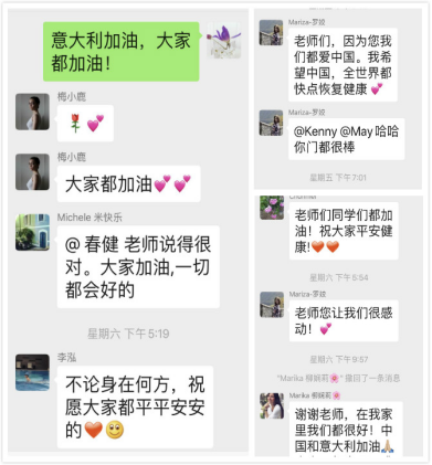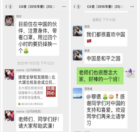 日本同学谷冈麻梨菜在班级微信群第一个号召大家支援武汉并发起为武汉募捐的倡议;沙特的穆德同学第一时间发微信慰问老师,还多次在朋友圈发文支持中国;周钲翔同学在印尼协助留在中国的姐姐募集口罩、支援中国抗疫;意大利学生May温馨提醒大家正确佩戴口罩,注意身体;苏里南的米隆同学在疫情期间坚守岗位,为中国的小朋友开展在线英语教学;希腊的罗姣同学专门录制了视频,为中国、为武汉加油!C4班的杨慧真、谭春健、刘春梅、李泓四位老师也时刻惦记着已结业的同学们,尤其是留在中国工作的几位同学,经常提醒他们做好防护。虽然大家分散在不同的国家,但师生之间、同学与同学之间,始终相互关心,彼此加油,就像相亲相爱一家人,温暖友爱,让人动容。