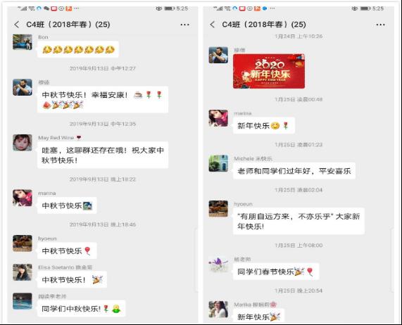 结业以后,C4班的很多同学都活跃在中外交流的第一线。米隆同学一直留在中国,从事英语教学和贸易工作;谷冈麻梨菜同学在北京海淀外国语学校担任日语老师;穆德同学今年被任命为沙特司法部的中沙司法合作协议顾问;意大利的May同学和俄罗斯的张玉莲同学不约而同地嫁给了中国人。师生之间和同学们彼此间的爱和友谊并没有因为结业而中断。意大利的梅小鹿同学在新学期入学时遇到了问题,杨慧真老师得知后主动提供帮助。希腊的罗姣同学今年1月申请奖学金时,第一时间想到请杨老师写推荐信。穆德同学不仅自己留在汉语速成学院继续学习,还带来了好几位沙特同胞一起学习。逢年过节,大家都会在微信上互致问候,虽然远隔万里,但那份温暖始终如初。