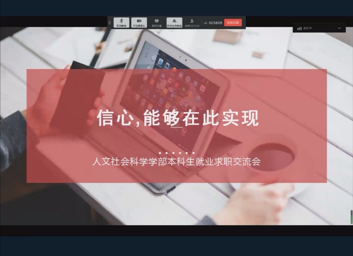 4月24日下午,人文社会科学学部举行了2016级本科生求职经验交流会。交流会采取线上视频互动的形式,学部党委副书记卜晨光老师出席了交流会,交流会由辅导员李双依老师主持,参加会议的还有学部辅导员段彤彤老师和2016级本科毕业生。