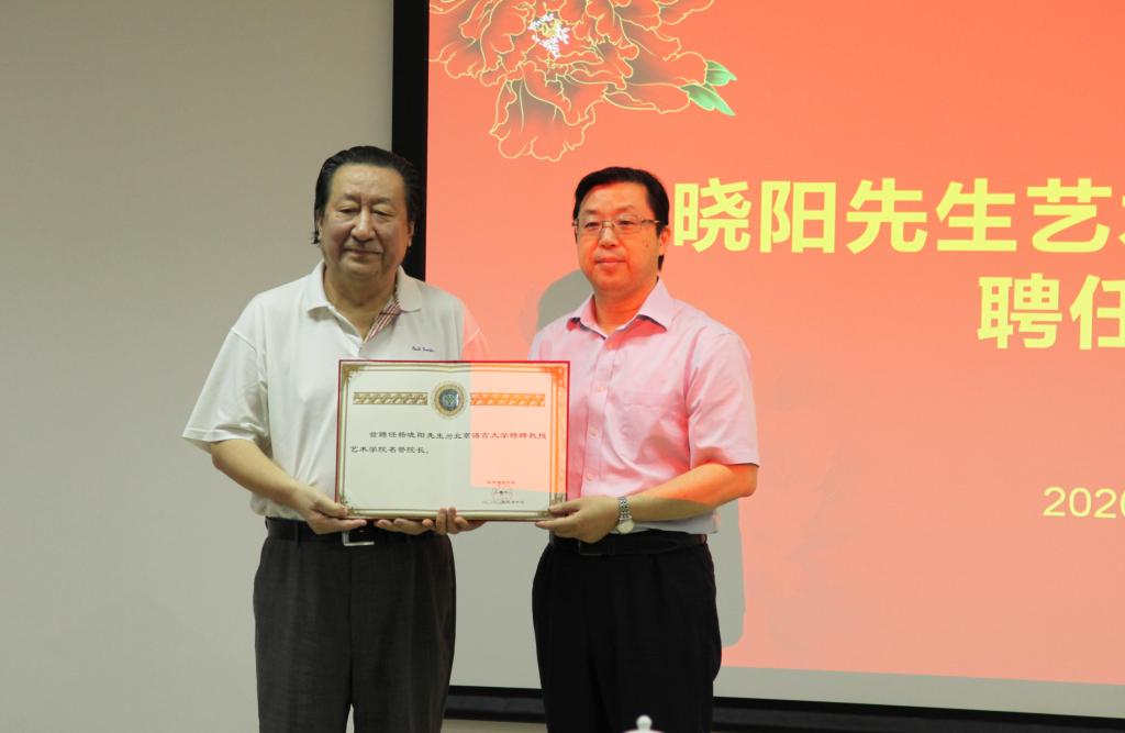 7月10日,北京语言大学举行聘任仪式,聘任杨晓阳先生为特聘教授、艺术学院名誉院长。学校办公室、组织部、人事处等相关职能部门负责人以及艺术学院全体教师参加聘任仪式,热烈欢迎杨先生加入北语。校长助理兼人事处处长郁有学主持聘任仪式。