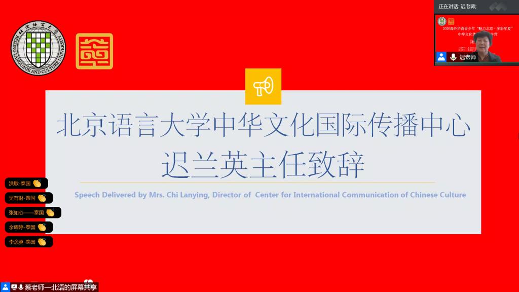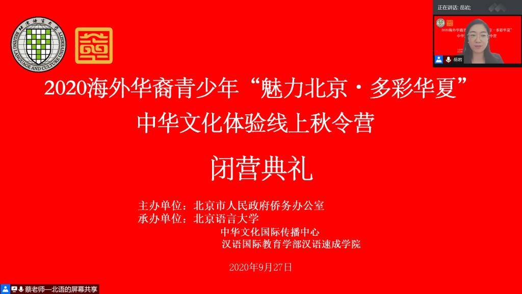 9月27日中午,由北京市人民政府侨务办公室主办、北京语言大学中华文化国际传播中心和汉语速成学院承办的2020海外华裔青少年“魅力北京·多彩华夏”中华文化体验线上秋令营举行了隆重而热烈的在线闭营典礼。北京语言大学中华文化国际传播中心主任迟兰英、汉语速成学院院长苏英霞、国际学生招生处处长周鑫、北京语言大学泰国代表处主任于美英,中华文化国际传播中心的相关负责老师以及来自泰国、印度尼西亚的95名华裔青少年和领队齐聚云端,共同见证了秋令营的完美收官。闭营典礼由中华文化国际传播中心的岳岩老师主持。