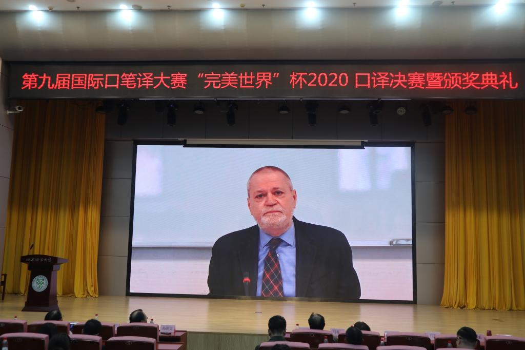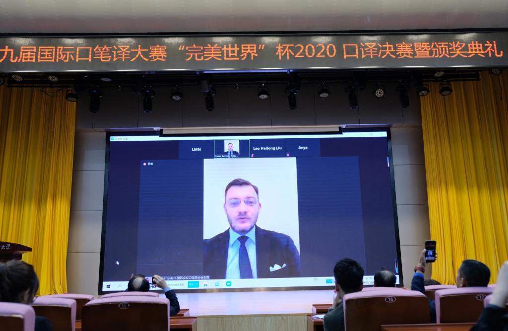 颁奖典礼上,北京语言大学刘利校长、中国翻译协会(TAC)口译委员会秘书长詹成、评委代表孙继文大使、赞助商完美世界代表石航为大赛致辞。国际大学翻译学院联合会主席Maurizio Viezzi为大赛特地录制了致辞视频现场播放,国际会议口译员协会主席Uros Peterc与大赛现场连线进行致辞。