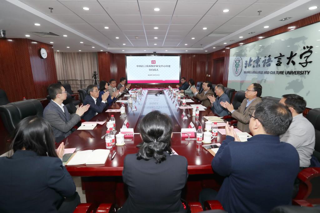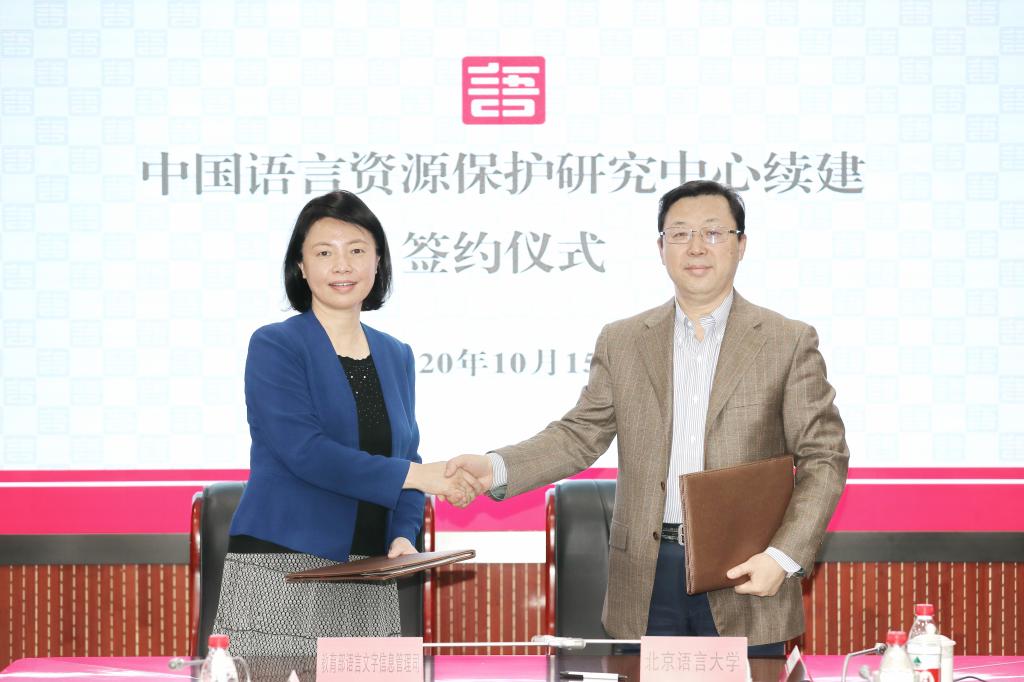 10月15日,教育部语言文字信息管理司与北京语言大学续建中国语言资源保护研究中心签约仪式在北京语言大学举行。教育部语信司司长田立新、北京语言大学校长刘利代表共建双方签署续建协议。教育部语信司副司长刘宏,北京语言大学副书记魏晖,中国语言资源保护工程首席专家、核心专家组组长曹志耘教授,北京语言大学相关职能机构负责人,国家语委在北语科研机构代表及语保中心全体人员参加仪式。