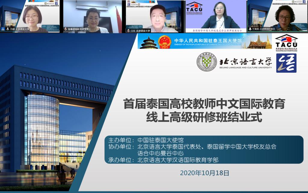 10月18日,首届泰国高校教师中文国际教育线上高级研修班顺利结业。本届高级研修班由中国驻泰王国大使馆教育组主办,泰国留学中国大学校友总会、北京语言大学泰国代表处、语合中心曼谷中心协办。