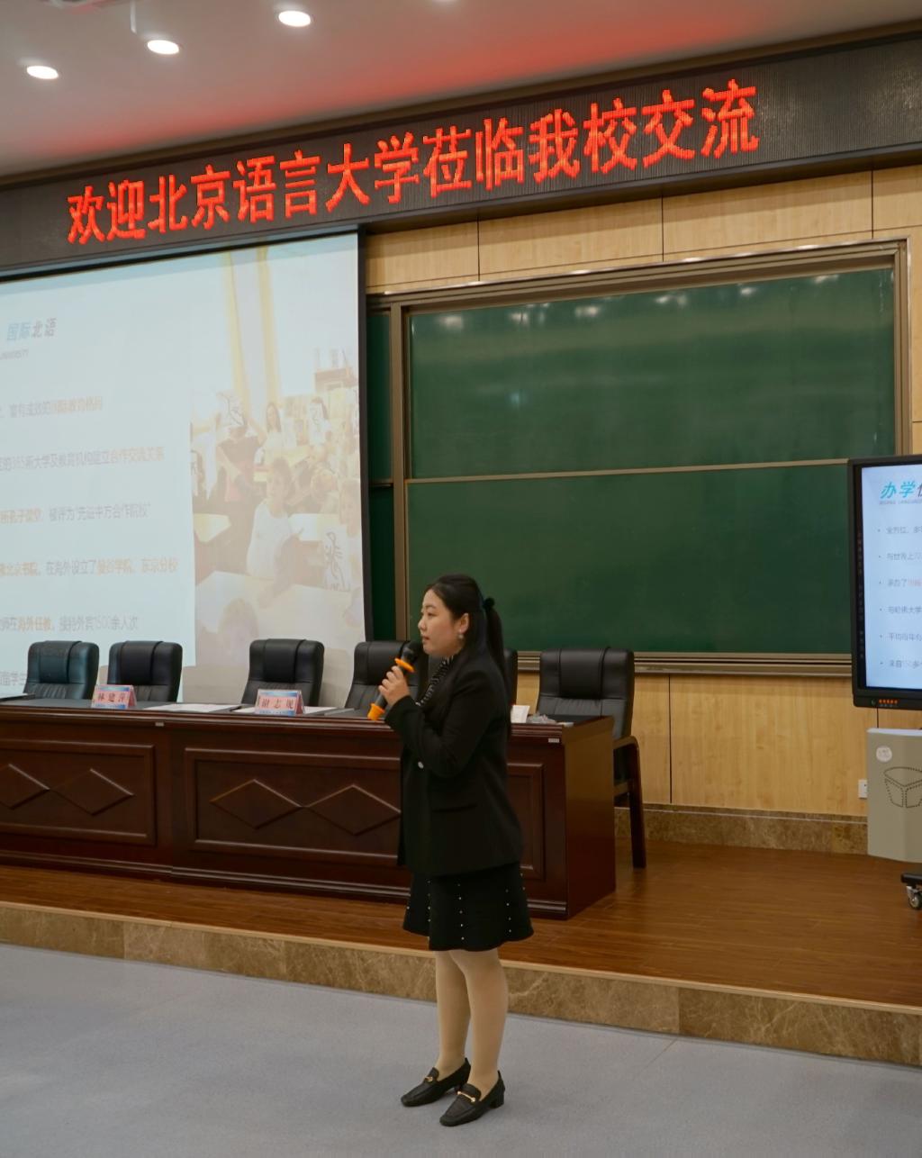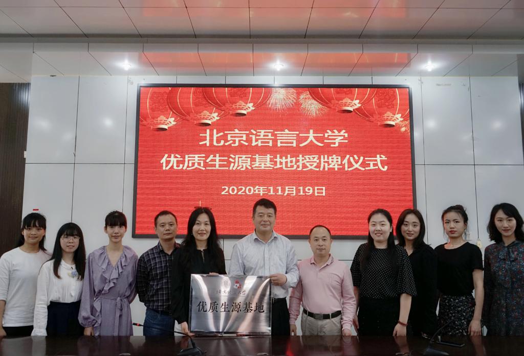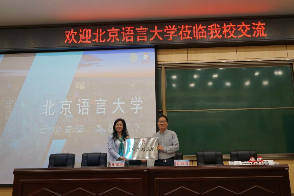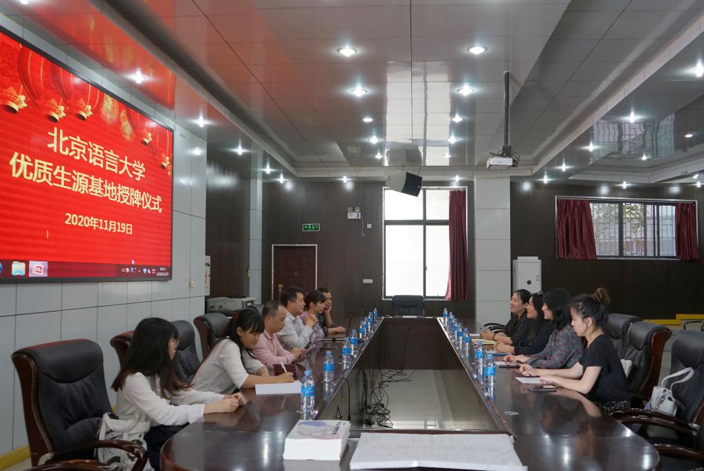 在广西师范大学附属外国语学校分校(桂林市国龙外国语学校),招生宣传组与常务副校长蒋龙飞等相关领导及教师代表举行了座谈会和授牌仪式。座谈会上,蒋龙飞副校长首先对招生宣传组的到来表示感谢,并就学校历史、师资和学生情况等进行了简单明了的介绍。自2009年以来,广西附外有40位同学考入北语,每年占北语在广西录取人数的比例不低于10%,最多一年接近30%,两校已经建立了较好的合作关系。蒋副校长期待未来两校能够继续相互信任、加强交流合作,共同实现更高质量的发展。招生宣传组也有针对性地就北语的专业情况、招生计划和学科特色进行了介绍,充分肯定了广西附外的教育教学成果,并表示希望有更多优质生源来到北语。双方还就进一步的合作提出了诸多可行设想。