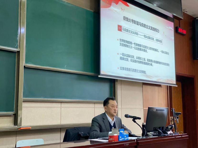 11月20日,主南102教室座无虚席,校党委书记倪海东为信息科学学院20级本科生以“疫情大考彰显马克思主义真理伟力”为题讲授了一堂精彩的思政课。