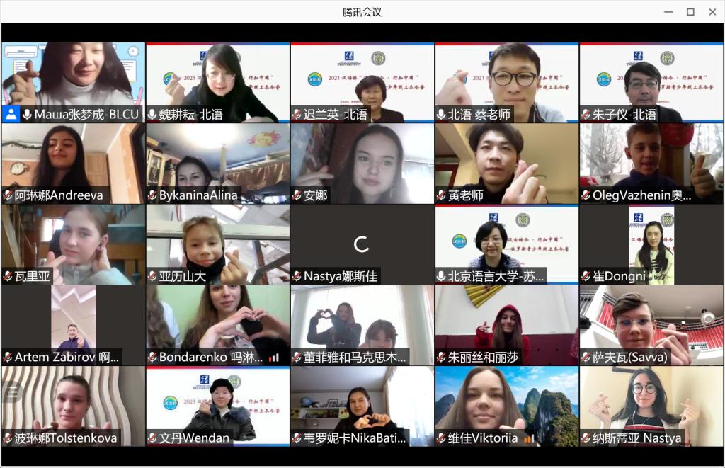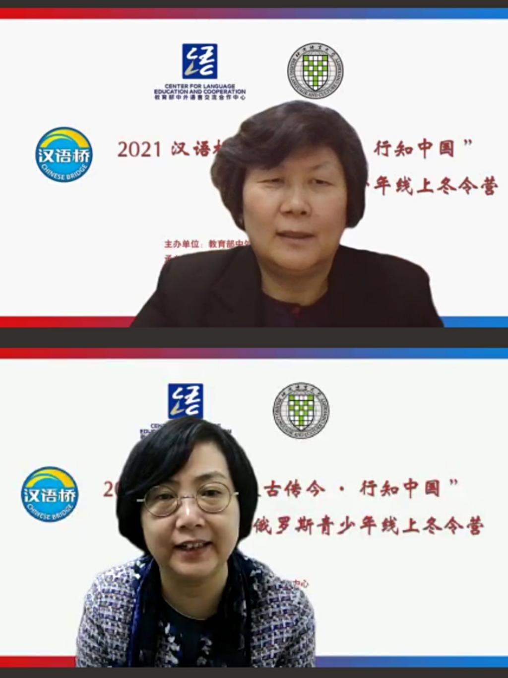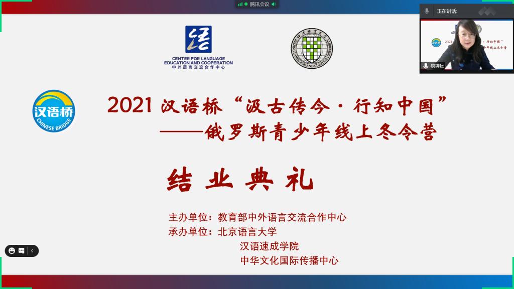 1月 22 日下午,汉语桥“汲古传今·行知中国”——俄罗斯青少年线上冬令营举行了闭营仪式。北京语言大学中华文化国际传播中心主任迟兰英、北京语言大学汉语速成学院院长苏英霞、俄罗斯国立高等经济大学东方学系教授安娜·安东诺娃、俄罗斯莫斯科1948中学教师谢尔盖·谢苗诺夫、北京语言大学国际学生招生处副处长崔冬妮、项目组教师,以及俄罗斯青少年冬令营的营员们在线上参加了闭营仪式。