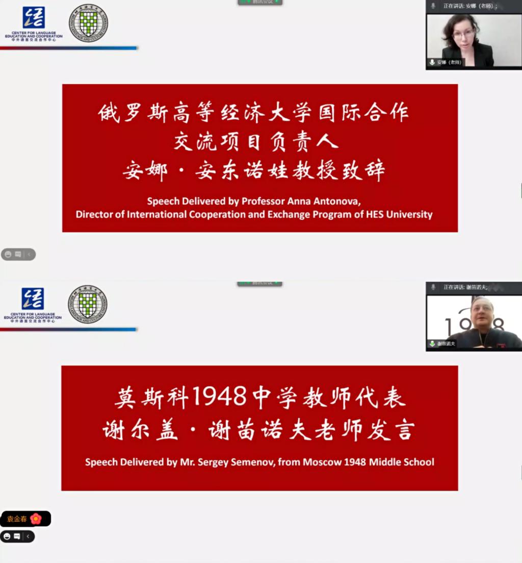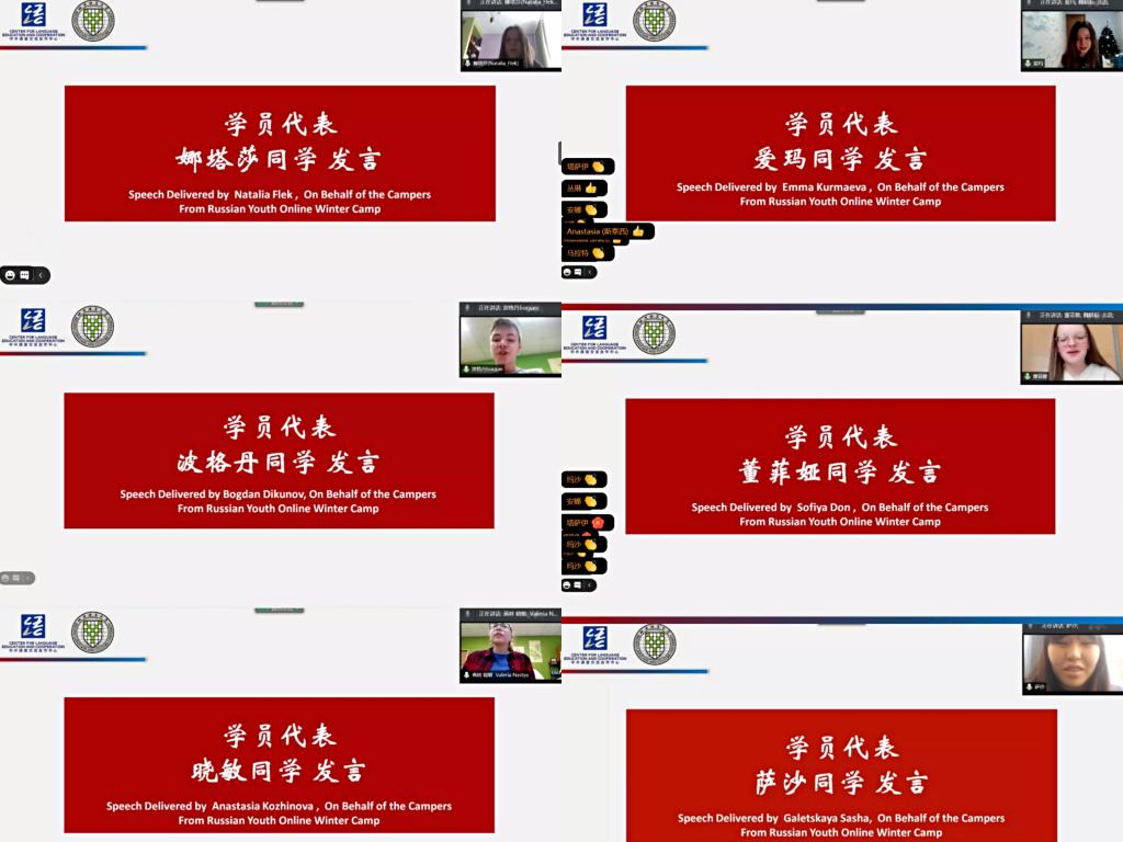 俄罗斯国立高等经济大学东方学系安娜·安东诺娃教授在发言中强调,三个星期的学习时间转瞬即逝,学生们学到了很多有用的课程,不仅学习了新的词句,也了解了中国文化。冬令营的老师们都很专业,他们准备了十分生动有趣的课程,非常引人入胜,而且专心倾听学生们的回答并一直热情鼓励他们。她说:“非常感谢北京语言大学为我们提供了参与线上冬令营的机会,我相信在这之后,学生们一定会更加喜爱中国和汉语,我们已经迫不及待地想去北京语言大学,去认识各位老师,走进教室上课,非常希望很快能有这样的机会。”莫斯科1948中学的谢尔盖·谢苗诺夫老师在发言中说,相信所有的同学都喜欢上了这种学习经历和学习形式,并且还想再次参加这样的学习,北语的老师们通过汉语桥引导营员们走向知识和新的实践。