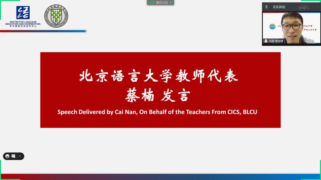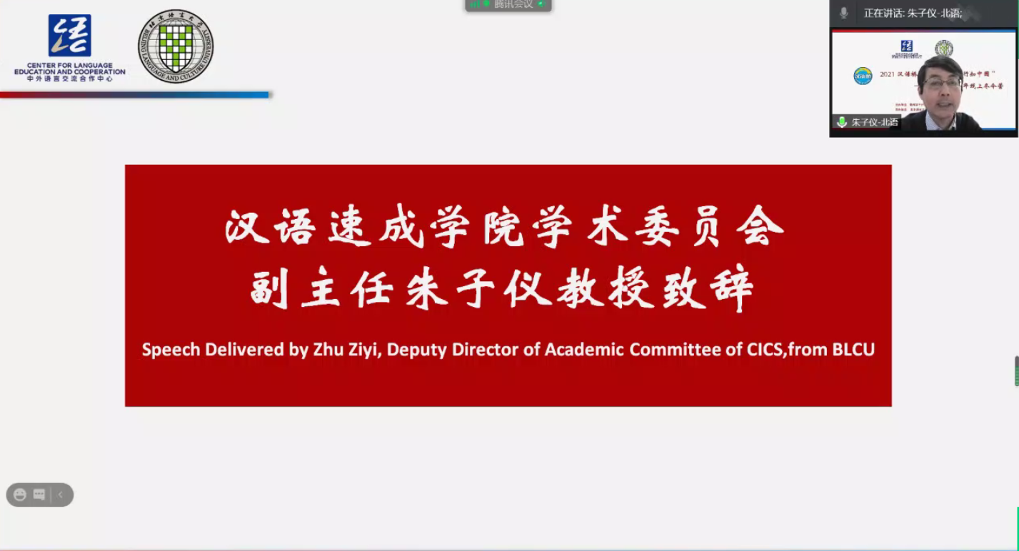 北京语言大学汉语速成学院学术委员会朱子仪副主任在致辞中特别提到了本次冬令营项目课程所体现的新理念,那就是“文化引领,语言强基”,在传授汉语基础知识的同时,以更多的文化体验和交流互动来满足同学们的学习兴趣和关注焦点,提升学习汉语言文化的动力,为营员们今后的学习和深造指明方向。他说,本次冬令营是一次轻松欢乐、具有很强获得感的汉语言文化体验和感悟之旅,相信参加这次线上冬令营的同学们会珍惜这次难忘的经历,珍惜自己取得的收获,并会把在这里学到的知识和得到的感悟与家人和朋友分享。