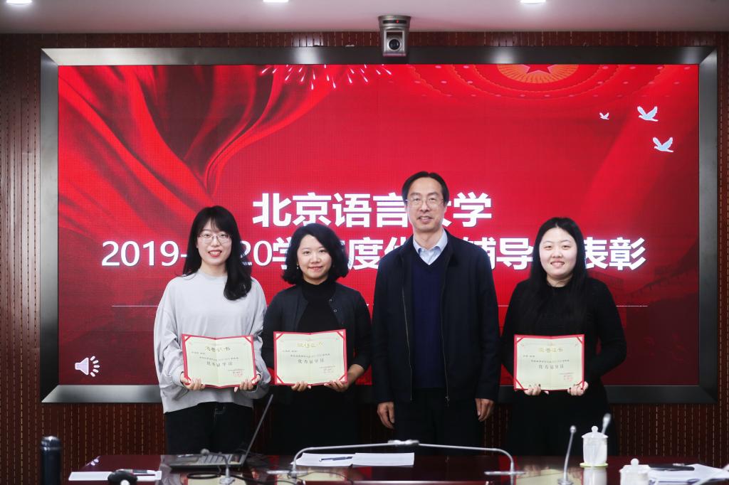 会议最后举行了北京语言大学2019-2020学年度优秀辅导员表彰仪式。学工部副部长张洋代表党委学工部宣读了《关于表彰2019-2020年度优秀辅导员的决定》。黄益方副校长为获得 “2019-2020学年度优秀辅导员”称号的商学院辅导员王慧媛老师,人文社会科学学部辅导员李双依老师和玄铮老师颁发荣誉证书,鼓励获得表彰称号的老师们再接再厉,并号召全体学生工作队伍在新学期以获得“优秀辅导员”表彰称号的老师们为榜样,用满腔热情全身心投入到学生工作中,以优异的工作成绩迎接建党100周年的到来。