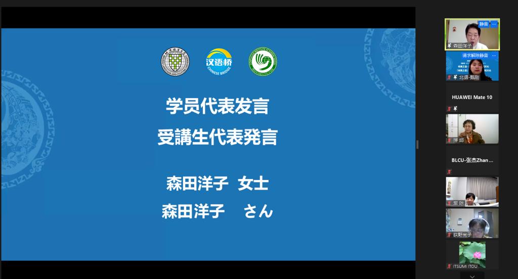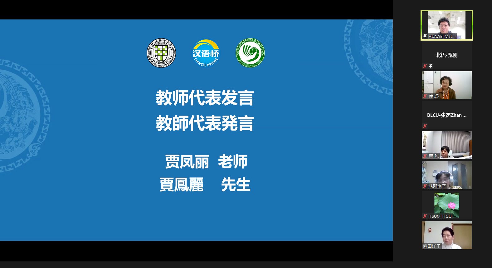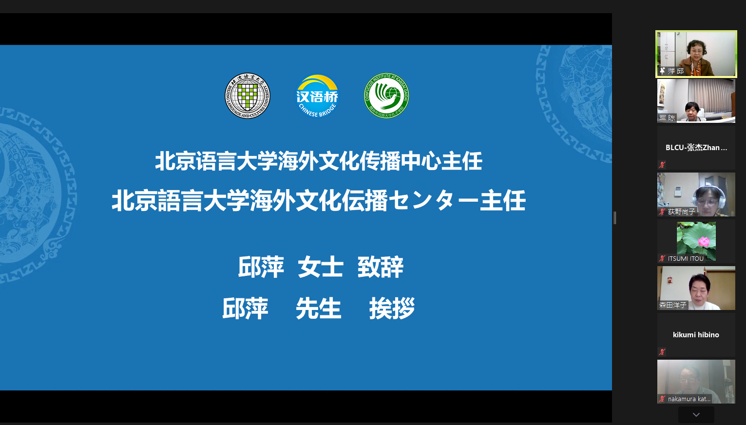 陈军女士在致辞中表达了对北京语言大学的感谢,她表示,在日本虽然不存在中医制度,但大家都非常重视中医养生治疗,中医服务很受欢迎。此次线上冬令营活动是日本友人深入了解中医药、中国药膳文化、中医养生之道的宝贵机会,虽然中日的中医学稍有不同,但中日两国都十分重视中医药,希望借此次机会增进中日各年龄群体间的文化交流互动,而这也是举办本次活动的意义之所在。